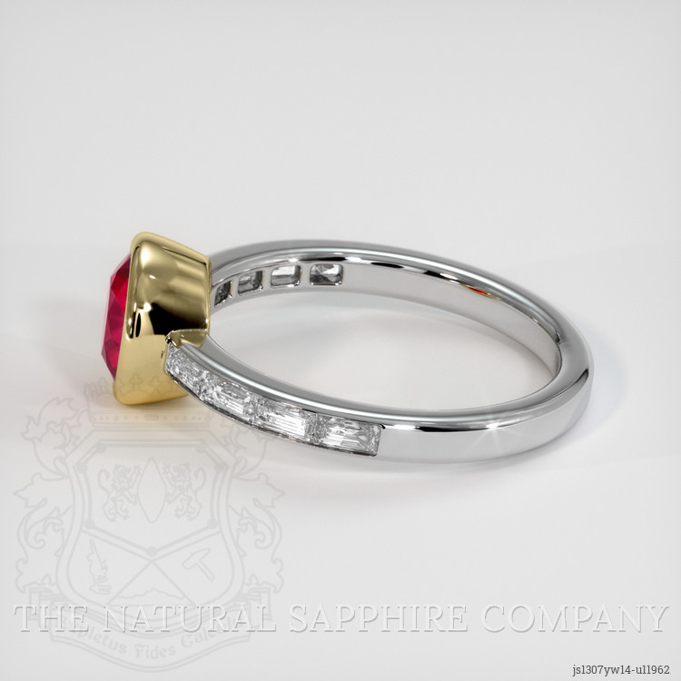 Adding to the allure of this unique piece, the ruby is accompanied by white baguette diamonds expertly set along the band. Weighing approximately 0.48 carats, these diamonds are not merely accents but essential elements that elevate the ring's overall sophistication. With a clarity range of VS1 to VS2 and a color grade of E, our diamonds significantly outperform typical selections. Competitors may offer diamonds of lesser grade and brilliance, but at The Natural Ruby Company, we ensure only the finest make it into our collections. These diamonds harmonize perfectly with the main ruby, enhancing its robust color while offering their own radiant sparkle.
