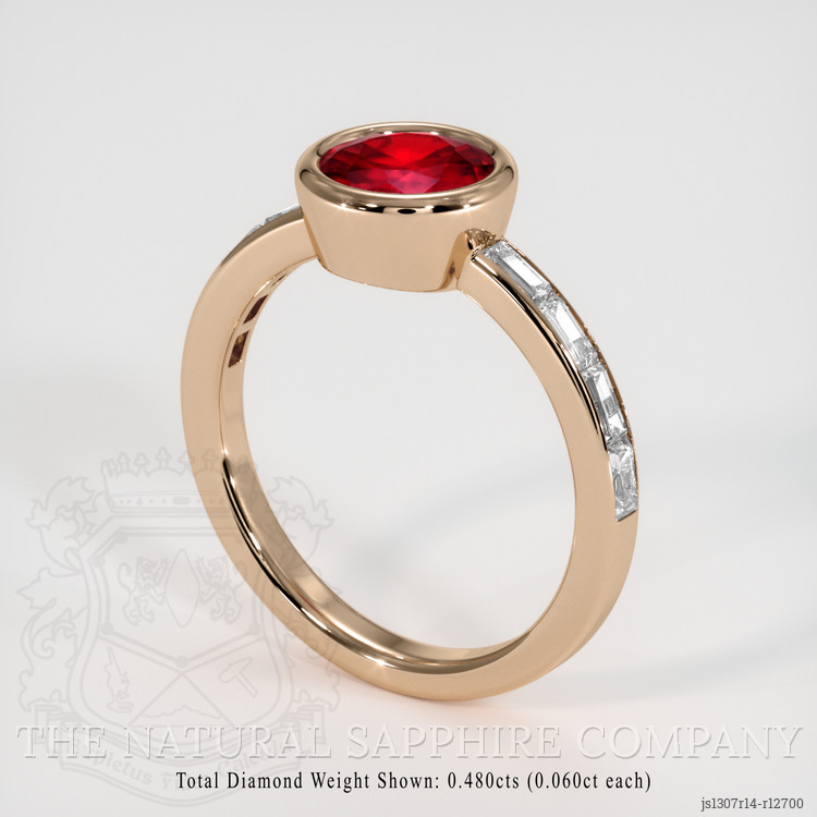 At the hands of our master jewelers, the ruby finds its perfect setting. Nestled within a band of 18K rose gold, its warm tones harmoniously echo the ruby’s fiery heart. The design gracefully draws attention to the ruby at the center, creating a focal point that captures admiration. Artfully set alongside are white, baguette-shaped diamonds totaling approximately 0.48 carats. With a color grade of E and clarity levels at VS1 and VS2, these diamonds compliment the ruby’s vivid luster, adding a scintillating frame that enhances the central stone’s enchanting narrative.