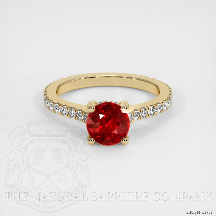 The ring features a beautiful, transparent 1.68 carat round shape red ruby with the dimensions of 6.73 x 6.68 x 4.54 mm and a mixed brilliant cut. It has a clarity grade of very slightly included (evaluated at eye level), vivid color saturation, and an excellent polish. The origin of this ruby is Mozambique.