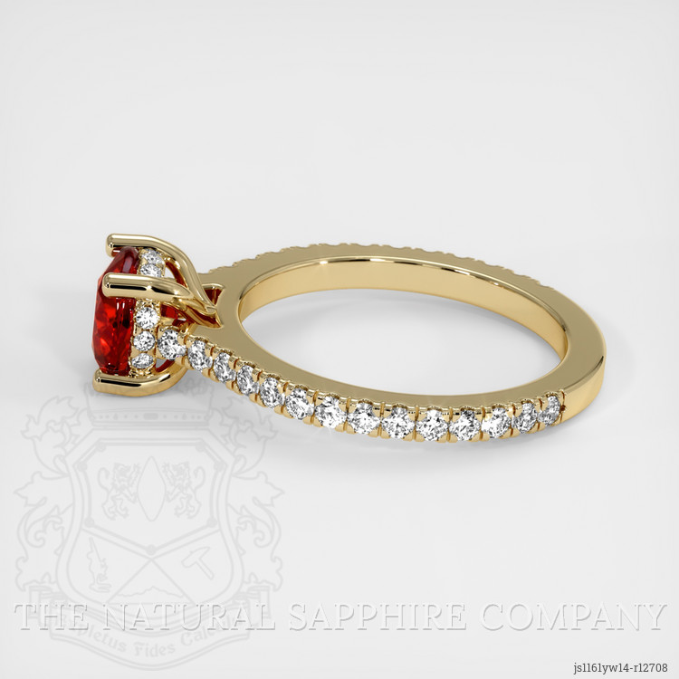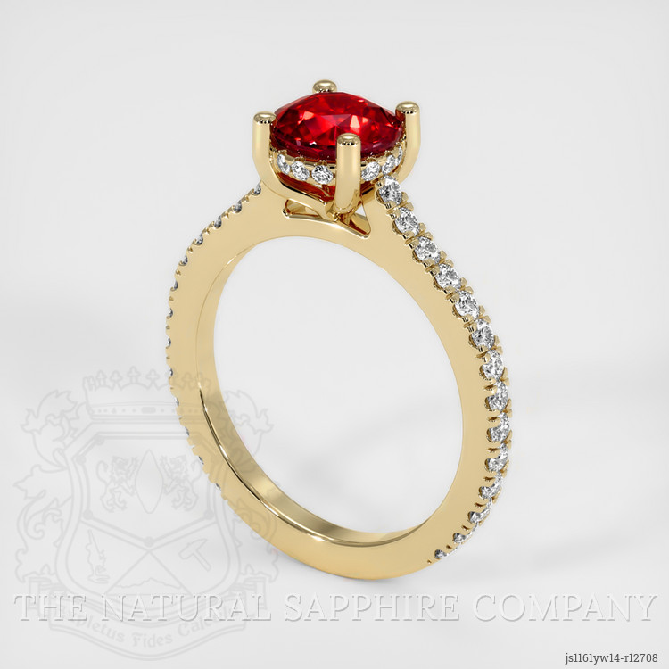 The ring features a beautiful, transparent 1.68 carat round shape red ruby with the dimensions of 6.73 x 6.68 x 4.54 mm and a mixed brilliant cut. It has a clarity grade of very slightly included (evaluated at eye level), vivid color saturation, and an excellent polish. The origin of this ruby is Mozambique.