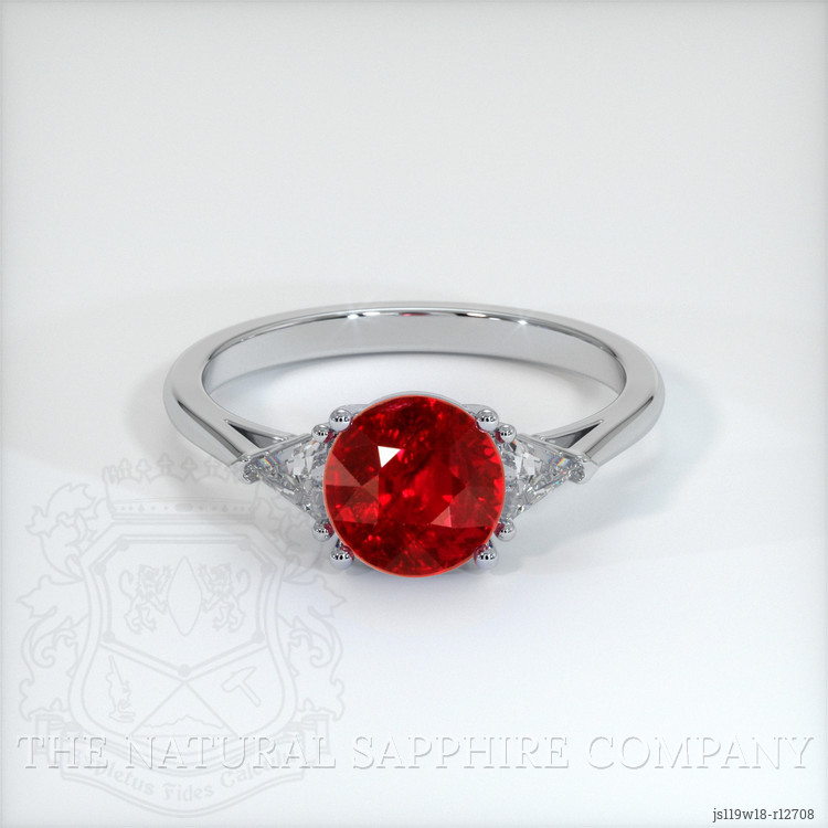 The ring features a beautiful, transparent 1.68 carat round shape red ruby with the dimensions of 6.73 x 6.68 x 4.54 mm and a mixed brilliant cut. It has a clarity grade of very slightly included (evaluated at eye level), vivid color saturation, and an excellent polish. The origin of this ruby is Mozambique.