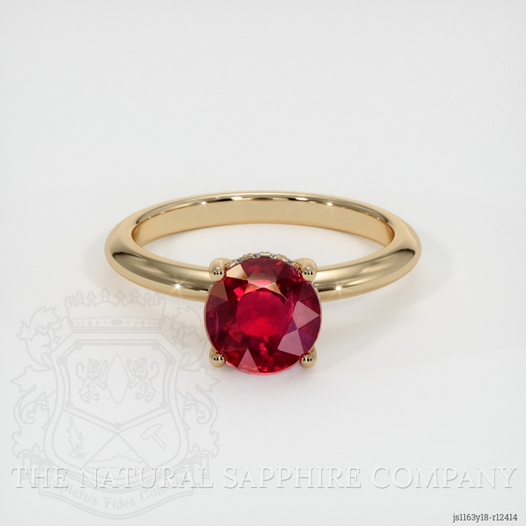 The ring features a beautiful, transparent 1.71 carat round shape red ruby with the dimensions of 6.68 x 6.66 x 4.38 mm and a mixed brilliant cut. It has a clarity grade of very slightly included (evaluated at eye level), vivid color saturation, and an excellent polish. The origin of this ruby is Mozambique.