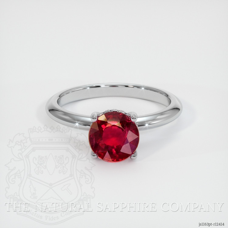 The ring features a beautiful, transparent 1.71 carat round shape red ruby with the dimensions of 6.68 x 6.66 x 4.38 mm and a mixed brilliant cut. It has a clarity grade of very slightly included (evaluated at eye level), vivid color saturation, and an excellent polish. The origin of this ruby is Mozambique.