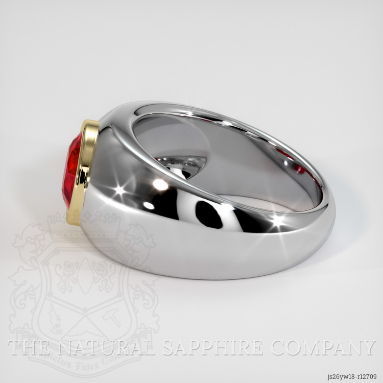 The surrounding 18K white gold band provides a striking contrast to the ruby’s vibrant color, enhancing the gem's presence with a sophisticated and modern appearance. The combination of metals not only augments the ruby’s incredible saturation but also highlights the precision of the cut and the excellent polish. The craftsmanship involved in the creation of this ring ensures that each facet of the ruby is showcased to its fullest potential, displaying its exceptional color and slightly included clarity. The expert metalwork of the 18K yellow and white gold accentuates the pristine clarity and deep hue of the Mozambique-origin ruby, making this men's ring an impressive display of artisanal skill and natural beauty.