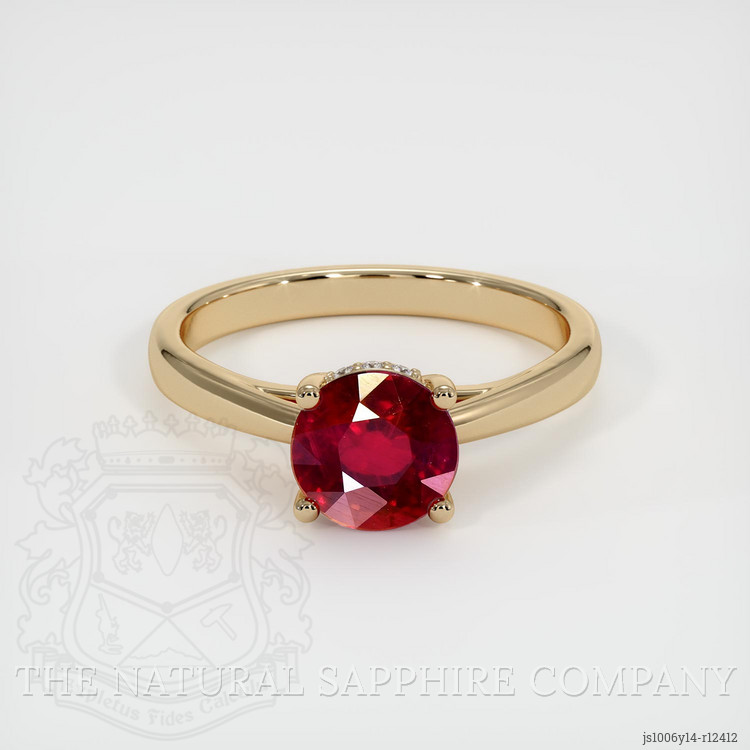 The ring features a beautiful, transparent 1.74 carat round shape red ruby with the dimensions of 6.72 x 6.67 x 4.77 mm and a mixed brilliant cut. It has a clarity grade of very slightly included (evaluated at eye level), vivid color saturation, and an excellent polish. The origin of this ruby is Mozambique.