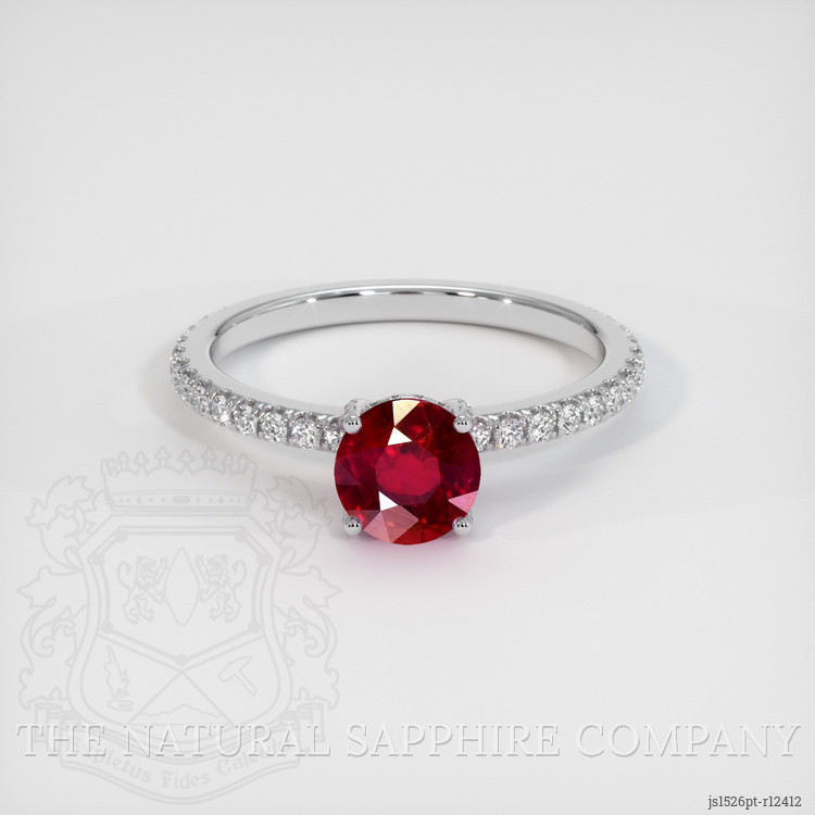 The ring features a beautiful, transparent 1.74 carat round shape red ruby with the dimensions of 6.72 x 6.67 x 4.77 mm and a mixed brilliant cut. It has a clarity grade of very slightly included (evaluated at eye level), vivid color saturation, and an excellent polish. The origin of this ruby is Mozambique.