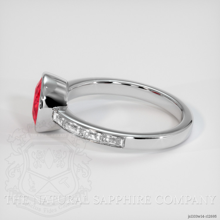 Complementing the ruby's vivid charm are white baguette diamonds of unrivaled elegance. These diamonds, weighing approximately 0.48 carats and possessing a superior color grade of E, capture and reflect light with every turn, shimmering with quiet sophistication. With a clarity grade of VS1 to VS2, they anchor the design in purity and strength, enhancing the ring's luxurious appeal. The profound contrast between the fiery red ruby and the pristine white diamonds is reminiscent of the duality of passion and purity, creating a rich tapestry of emotion that is sure to resonate in the heart of its wearer.