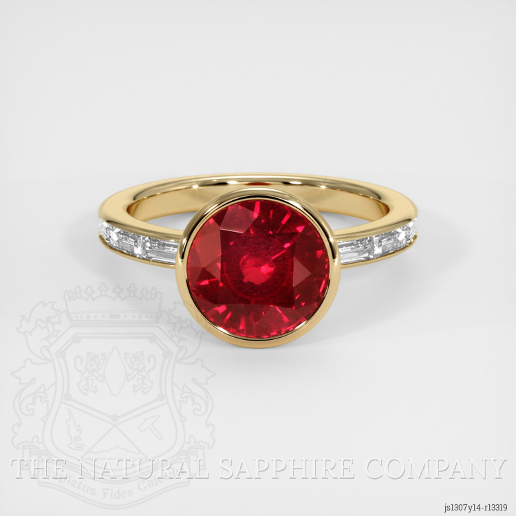 The ring features a beautiful, transparent GIA certified Red 3.73 carat round shape red ruby with the dimensions of 8.83 x 8.75 x 6.14 mm and a mixed brilliant cut. It has a clarity grade of very slightly included (evaluated at eye level), vivid color saturation, and an excellent polish. The origin of this ruby is Mozambique.