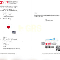 The ring features a beautiful, transparent GRS certified Vivid Red “Pigeon’s Blood” 5.40 carat round shape red ruby with the dimensions of 9.73 x 9.59 x 6.80 mm and a mixed brilliant cut. It has a clarity grade of very slightly included (evaluated at eye level), vivid color saturation, and an excellent polish. The origin of this ruby is Mozambique.