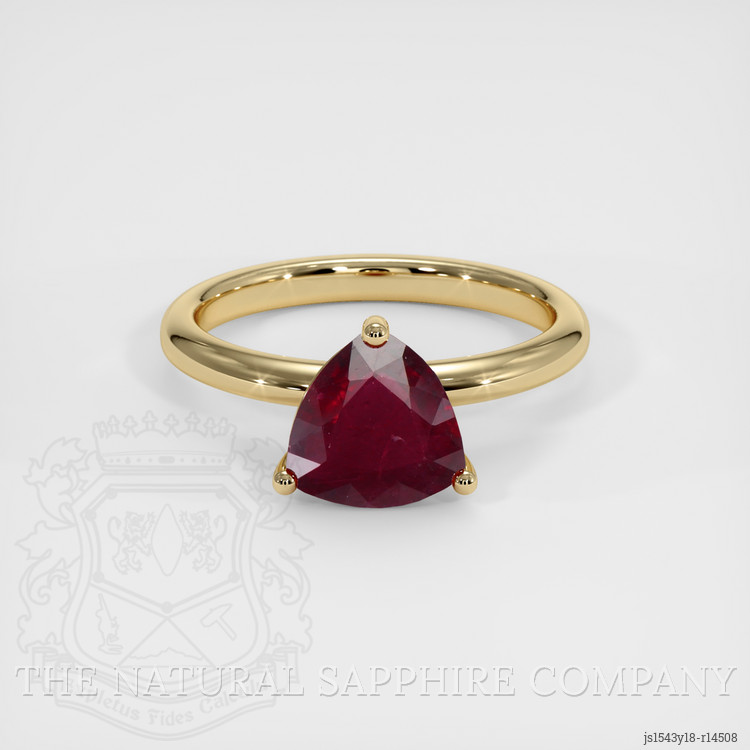 At The Natural Ruby Company, we understand that choosing the perfect engagement ring is more than just a purchase; it is a promise, a testament to everlasting love and devotion. Our exquisite ring, featuring a 1.47 carat trillion shape red ruby set in 14K yellow gold, is crafted to embody these sentiments. With its dimensions of 7.61 x 7.39 x 3.03 mm and a mixed brilliant cut, this ruby dazzles with unparalleled elegance, symbolizing the unique and enduring bond shared between partners. Bathed in a bold, dark color saturation, and exhibiting a slightly included clarity grade, the gem carries an intrinsic beauty that mirrors the multifaceted journey of love itself.