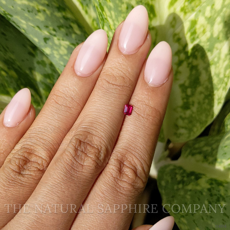 In the soft glow of any light, the vivid color intensity of this ruby reveals its soul-stirring essence. This is more than a vivid purplish-red hue. It's a passionate dance of light and color destined to create a bond with its wearer. Each facet of its flawlessly emerald-cut precision radiates a dazzling splendor that draws admirers closer, eager to appreciate its small yet powerful presence. The clarity grade, gently hinting at its natural origins, serves as a subtle reminder of authenticity. It speaks of earth's artistry, refined not to perfection beyond recognition, but toward a state of relatable elegance.