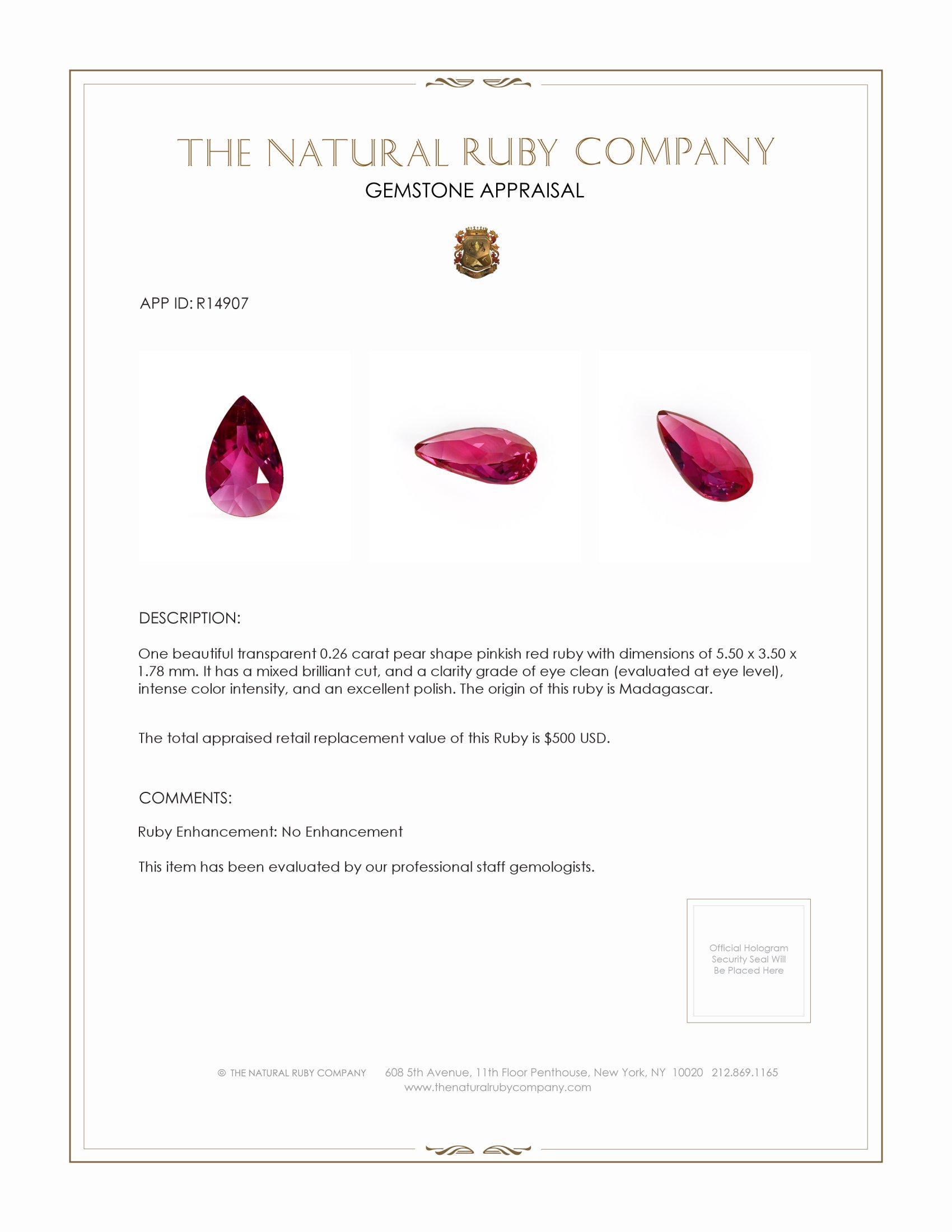 When searching for a centerpiece gemstone that exudes elegance and radiance, it's essential to select one that not only meets high standards of quality but also stands out in uniqueness and beauty. Among the myriad options available on the market today, this breathtaking transparent 0.26 carat pear shape pinkish red ruby sourced from the esteemed lands of Madagascar undeniably commands attention. The Natural Ruby Company presents this remarkable gemstone, renowned for its captivating intense color intensity and its eye-clean clarity grade, ensuring that every facet sparkles under the light, creating an alluring luminescence that promises to draw admiration from all who behold it.