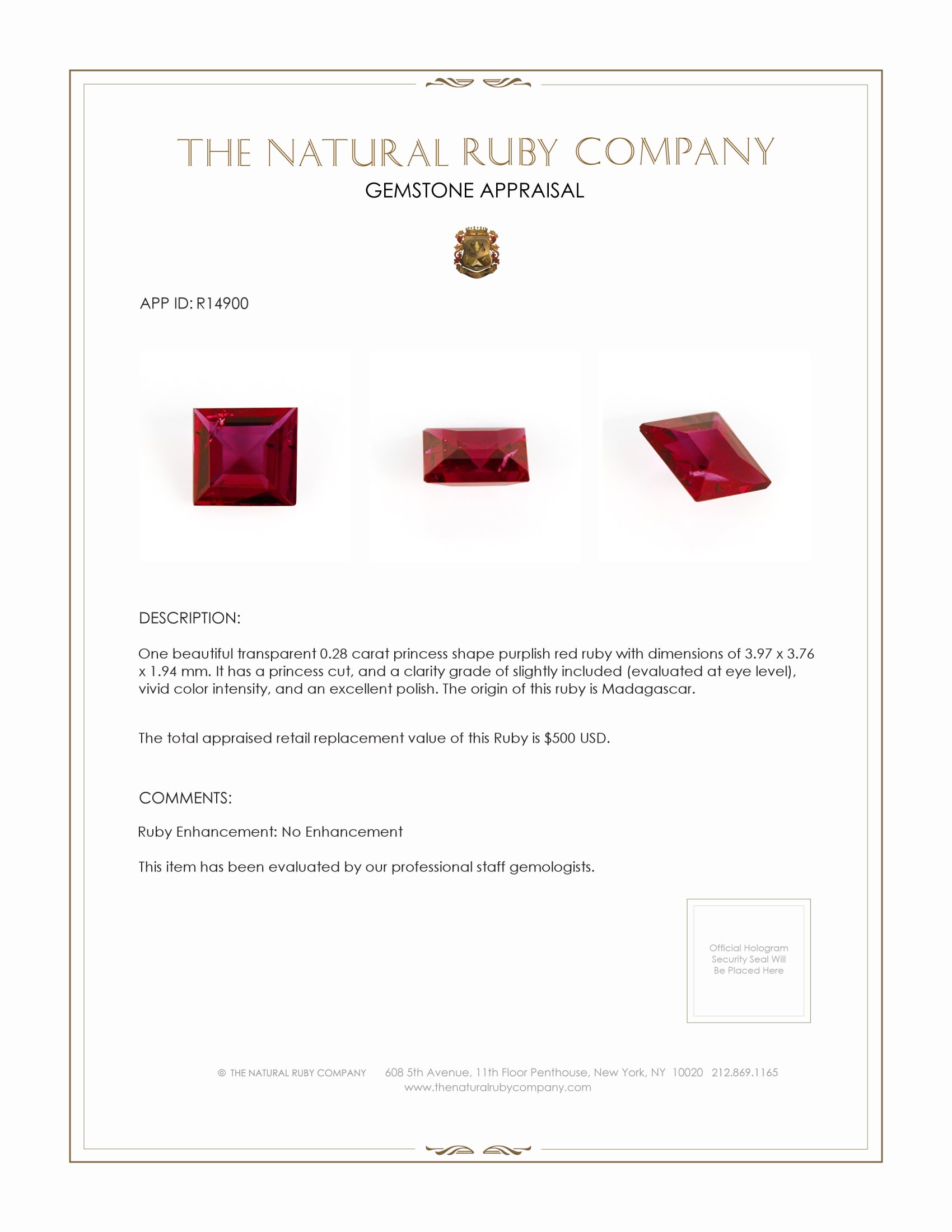 At The Natural Ruby Company, we take pride in presenting our exquisite 0.28 carat princess-shaped purplish red ruby. Sourced from the rich landscapes of Madagascar, this ruby is a testament to nature’s unparalleled artistry and our commitment to excellence. When compared to other gemstones available on the market, our ruby stands out with its superior qualities and impressive durability. Rated 9 on the Mohs scale, rubies are second only to diamonds in hardness. This ensures that your gemstone remains as timeless and resilient as the love or memory it symbolizes. Lesser gemstones often fall short of this mark, making rubies the preferred choice for those seeking both beauty and durability.