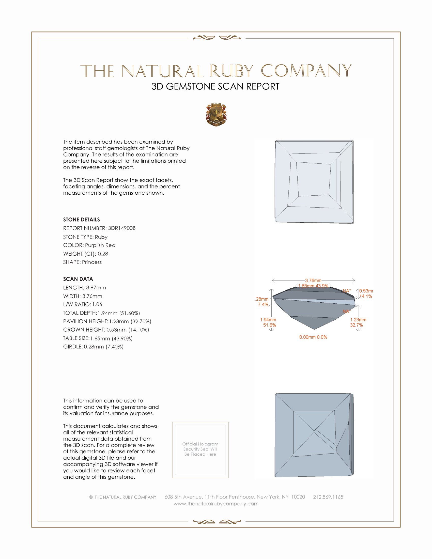 The ruby is cut to perfection, with an excellent polish that elevates its overall allure. Its princess cut amplifies brightness and sparkle, a popular choice for modern jewelry enthusiasts drawn to clean lines and contemporary elegance. While many gemstones attempt to mimic this effect, few can rival the artistry demonstrated in our ruby’s craftsmanship. Our skilled artisans ensure that each cut reflects light perfectly, a quality assured by our superior polishing techniques. Additionally, the gem’s dimensions, tailored to 3.97 x 3.76 x 1.94 mm, provide an ideal balance between subtlety and statement, offering versatility whether set in a ring, pendant, or other jewelry design.
