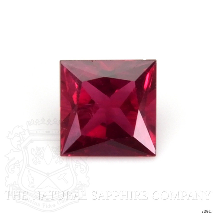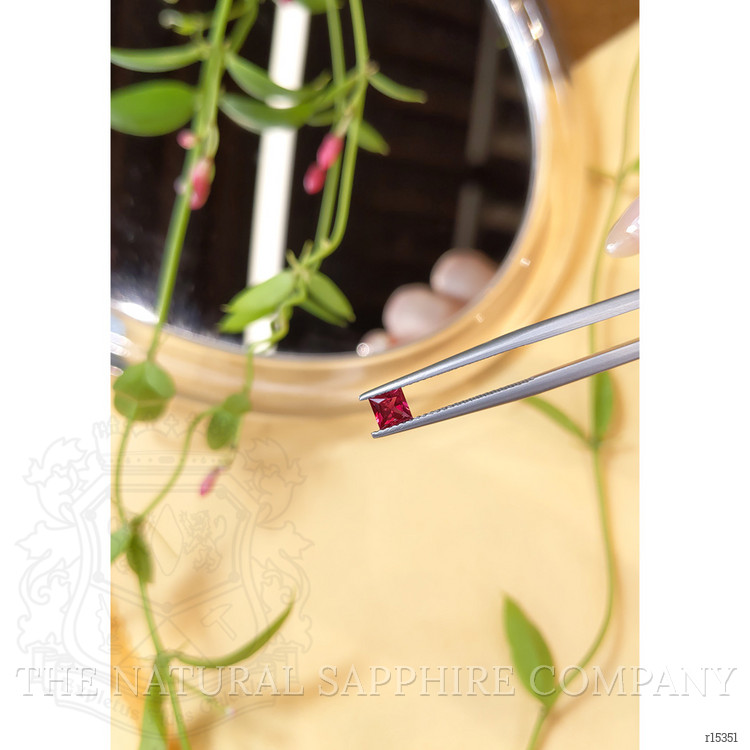 The cutting choices were deliberate, and they amplify properties that come from the ruby's inner architecture. The square princess shape focuses color toward the center, producing a glowing heart of crimson when seen face up, while the step of the pavilion directs light up through the crown facets to create dynamic contrast between fire and depth. Heat treated enhancement was applied by expert hands to stabilize and intensify the tone, a traditional and widely accepted practice that brings out the best in rubies while keeping their natural origin visible. In this stone the result is a balance, the intense red that captures attention without losing transparency, and a symmetry that makes every polished edge sing. When set into a ring or pendant, the stone will perform with rare brilliance, catching sun or lamp light and throwing it back with a signature sparkle that comes from the interplay of a high refractive index, careful facet alignment, and that intense uniform color. Its small dimensions make it versatile, ideal for a refined solitaire, a delicate halo, or matched pairing in elegant studs.
