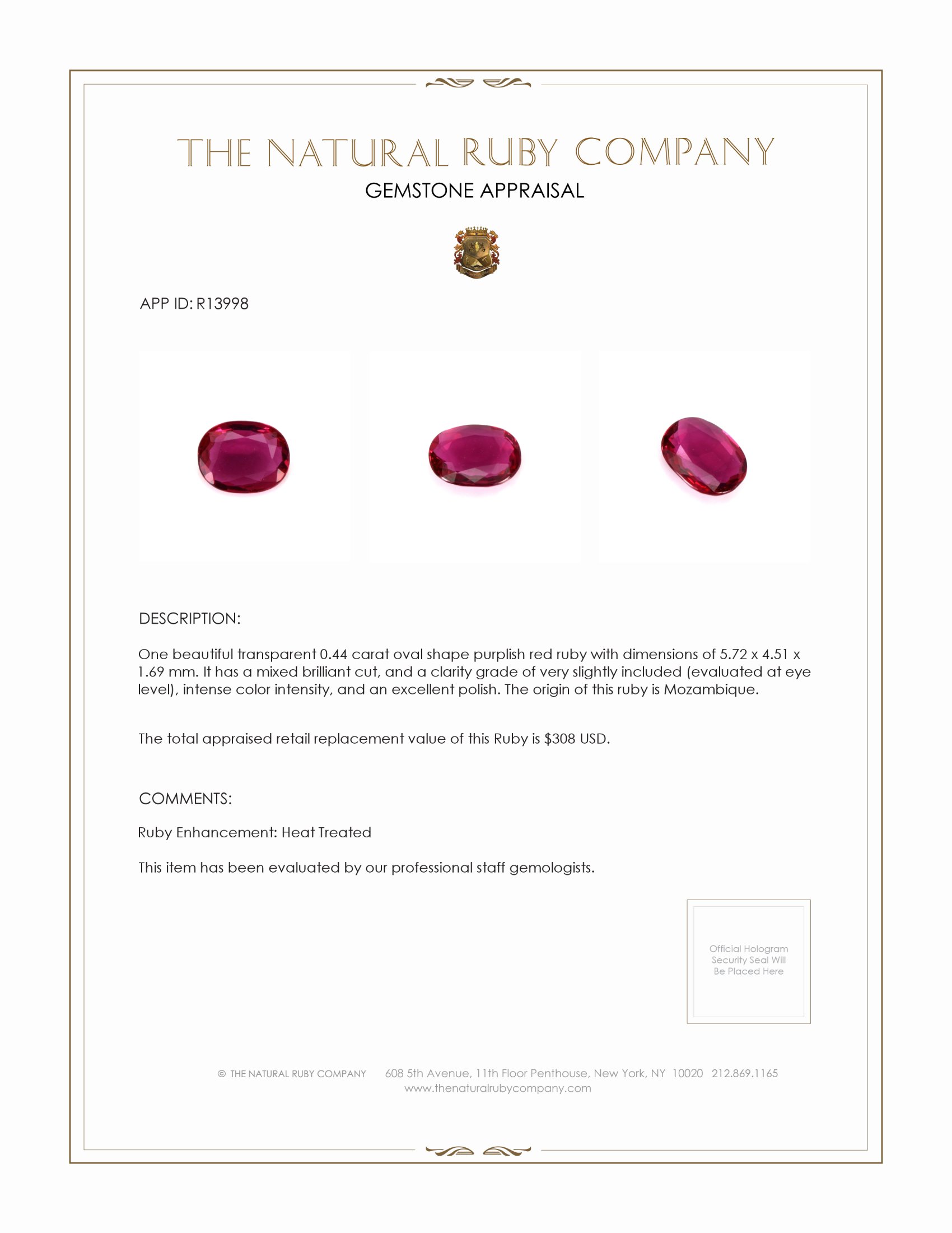 Discover the enchanting allure of our exquisite purplish red ruby, an extraordinary gemstone that speaks to the heart and soul of every jewelry enthusiast. This breathtaking 0.44 carat ruby, masterfully cut into an elegant oval shape measuring 5.72 x 4.51 x 1.69 mm, embodies the very essence of sophistication and rarity. With its mixed brilliant cut and a clarity grade of very slightly included, this gem captures light with an unparalleled brilliance that is sure to captivate. Its intense color intensity radiates a vibrant purplish red hue, promising to be the centerpiece of any fine jewelry collection. Meticulously polished to perfection, this ruby originates from the rich lands of Mozambique, renowned for producing some of the world's most sought-after colored gemstones. At The Natural Ruby Company, we pride ourselves on delivering gems that transcend the ordinary, and this ruby is no exception.