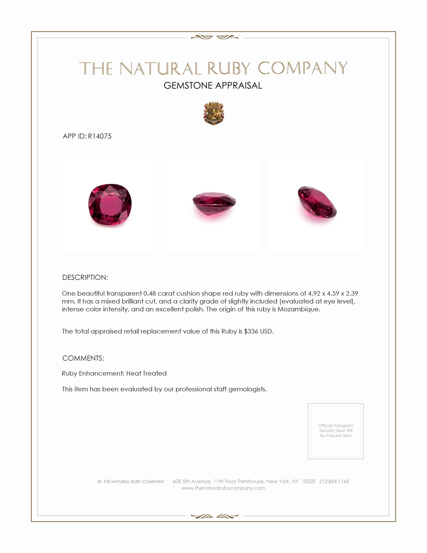 Discover the timeless elegance of our exquisite Mozambican red ruby, a gemstone that embodies both versatility and sophistication. The Natural Ruby Company proudly presents this stunning treasure, perfect for those who seek a blend of classic allure and modern luxury. This beautiful transparent ruby boasts a captivating cushion shape and weighs 0.48 carats, offering a delicate yet striking presence. Measuring 4.92 x 4.59 x 2.39 mm, this gem promises to complement any collection with its refined dimensions.