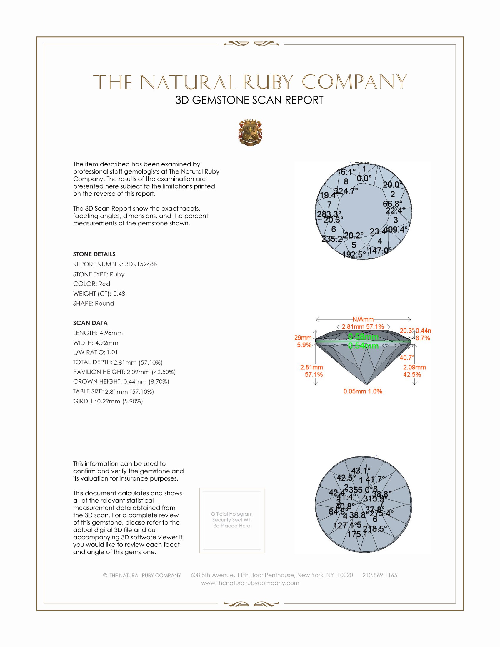 Discover the timeless allure of the magnificent ruby, a gemstone whose legacy is as rich as its captivating hue. Our exquisite 0.48 carat round shape red ruby, sourced from the historic lands of Mozambique, boasts a mesmerizing vivid color intensity that draws the beholder into its depths. The stone's brilliant transparency and expertly crafted dimensions of 4.98 by 4.92 by 2.81 mm make it a quintessential choice for those who dare to make a statement. Its outstanding polish and mixed brilliant cut ensure that it captures light with unparalleled brilliance, elevating any piece of jewelry to a level of sophistication that is both enduring and unmatched.