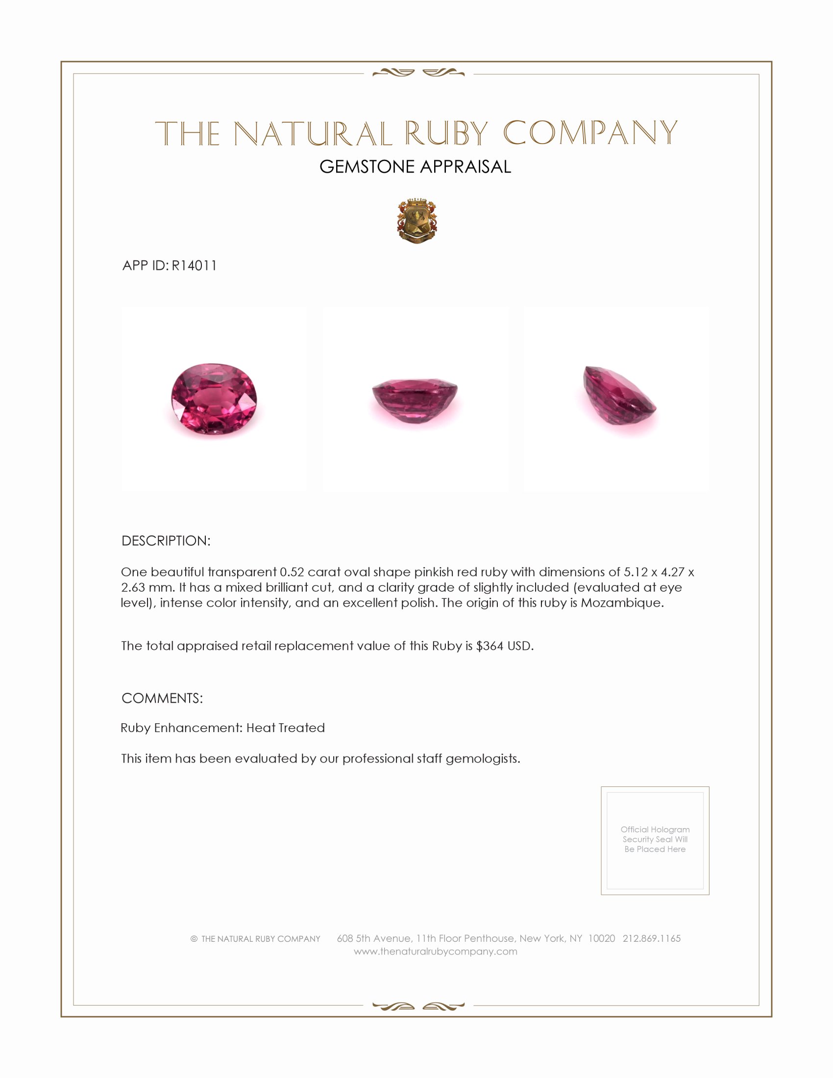 In a world where time pauses for the heart’s tender desires, there lies a stone of unparalleled beauty—a radiant 0.52 carat pinkish red ruby that whispers tales of both genesis and wonder. Nestled at the threshold of nature's artistry, this captivating gem, with its tantalizing dimensions of 5.12 x 4.27 x 2.63 mm, serves as an emblem of love’s eternal flame and the mysteries of its origin. Sourced from the enigmatic lands of Mozambique, the ruby inherits the powerful symphony of a sun kissed by twilight, an element that folds into the core of its deep-imbued grace.