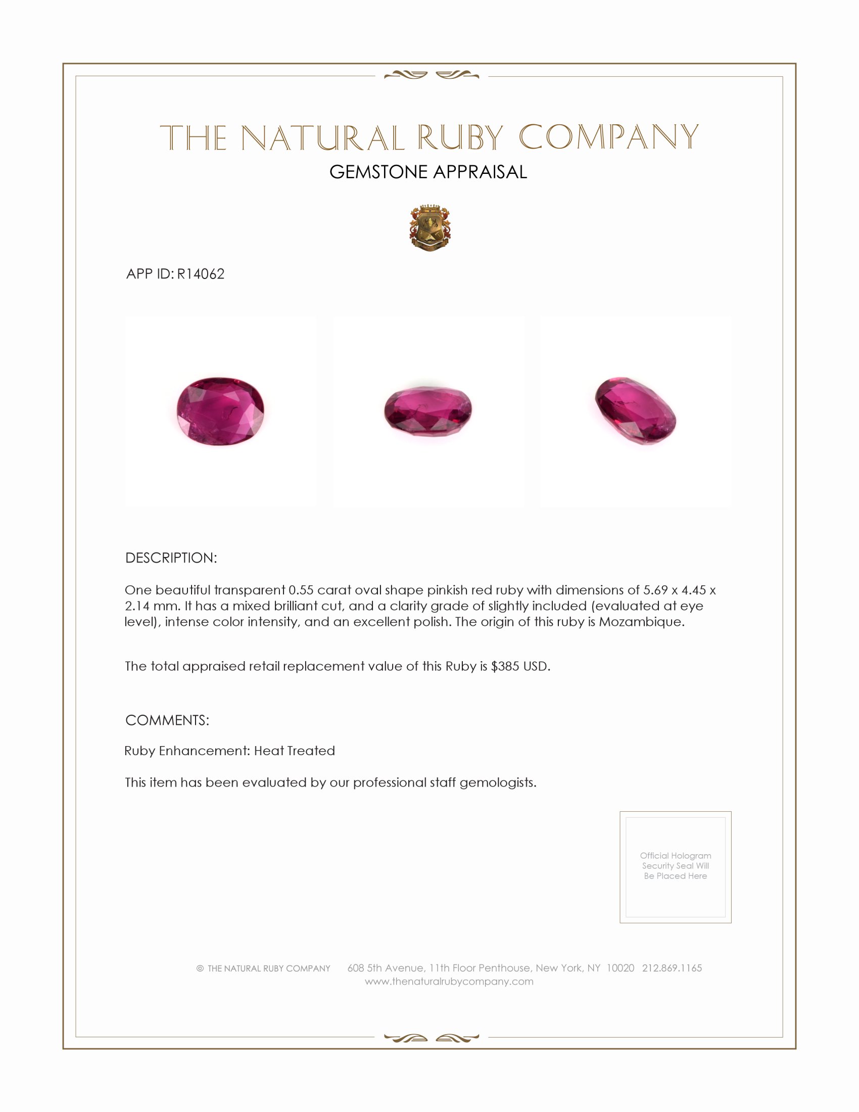 Discover the captivating allure of a jewel that promises to evoke emotions of joy and wonder each time you or a loved one beholds its radiant hue. This exquisite 0.55 carat oval-shaped pinkish-red ruby represents not just a gem, but a glimpse into a world of colorful whispers and refined elegance. Nestled in any jewelry setting, this ruby's vibrant color stands out, creating a statement that words alone cannot capture. With dimensions of 5.69 x 4.45 x 2.14 mm, this gemstone embodies a tale of authenticity and beauty that intertwines with time and sentiment.