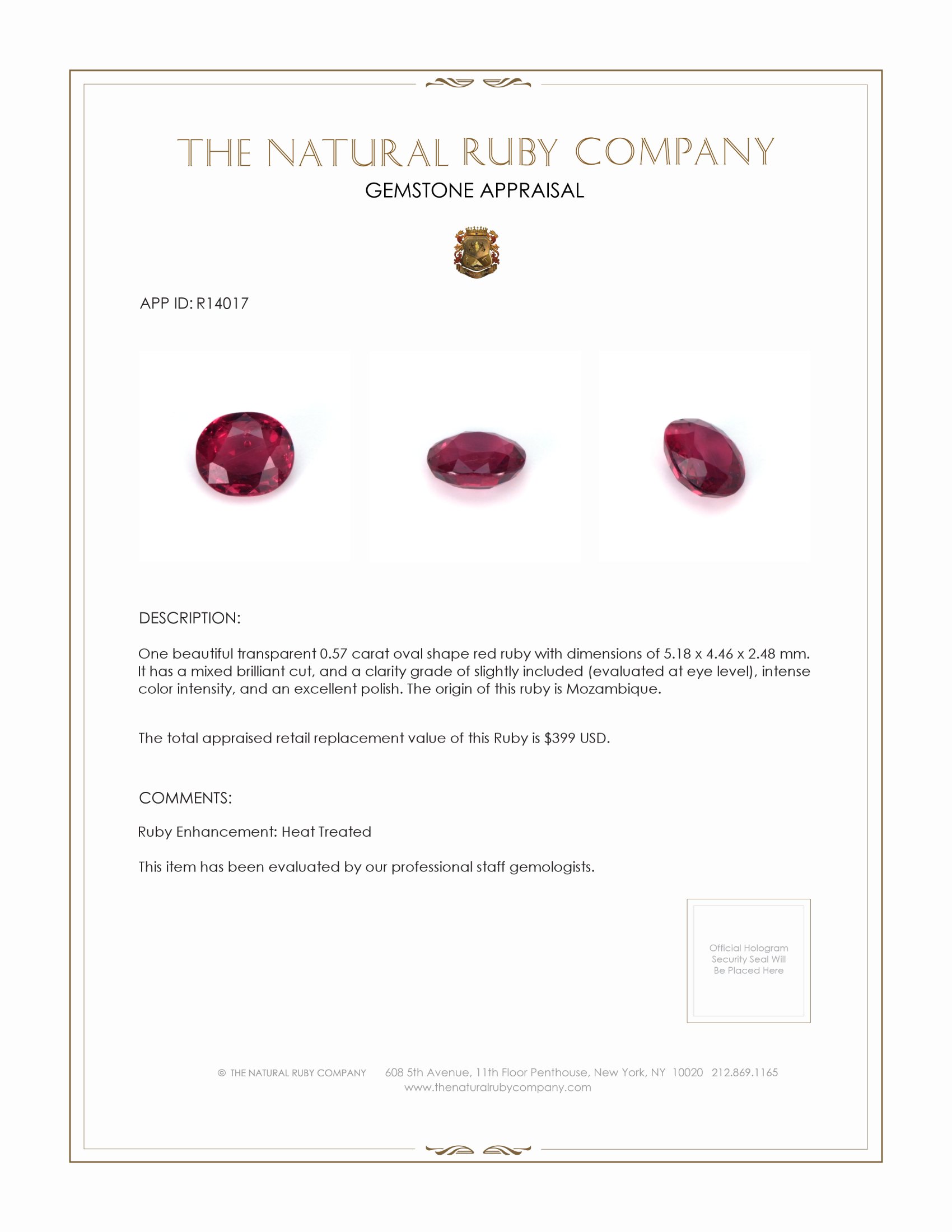 In the heart of Mozambique, amid rolling hills laden with rich mineral deposits, began the remarkable journey of a mesmerizing gemstone that encapsulates the fiery spirit of its land of origin. This exquisite ruby, a transparent 0.57 carat oval marvel, emerged from the earth with dimensions of 5.18 x 4.46 x 2.48 mm, a testimony to the meticulous processes that shape the treasures hidden beneath the rugged terrain. The complexity of its formation bears witness to the geological symphony that played out over millennia, crafting a stone of such rarity and allure. As miners with time-honed skills unearthed this gemstone, it was immediately apparent that they had uncovered a jewel of extraordinary quality, destined to become more than just an adornment, but indeed a legacy in its own right.
