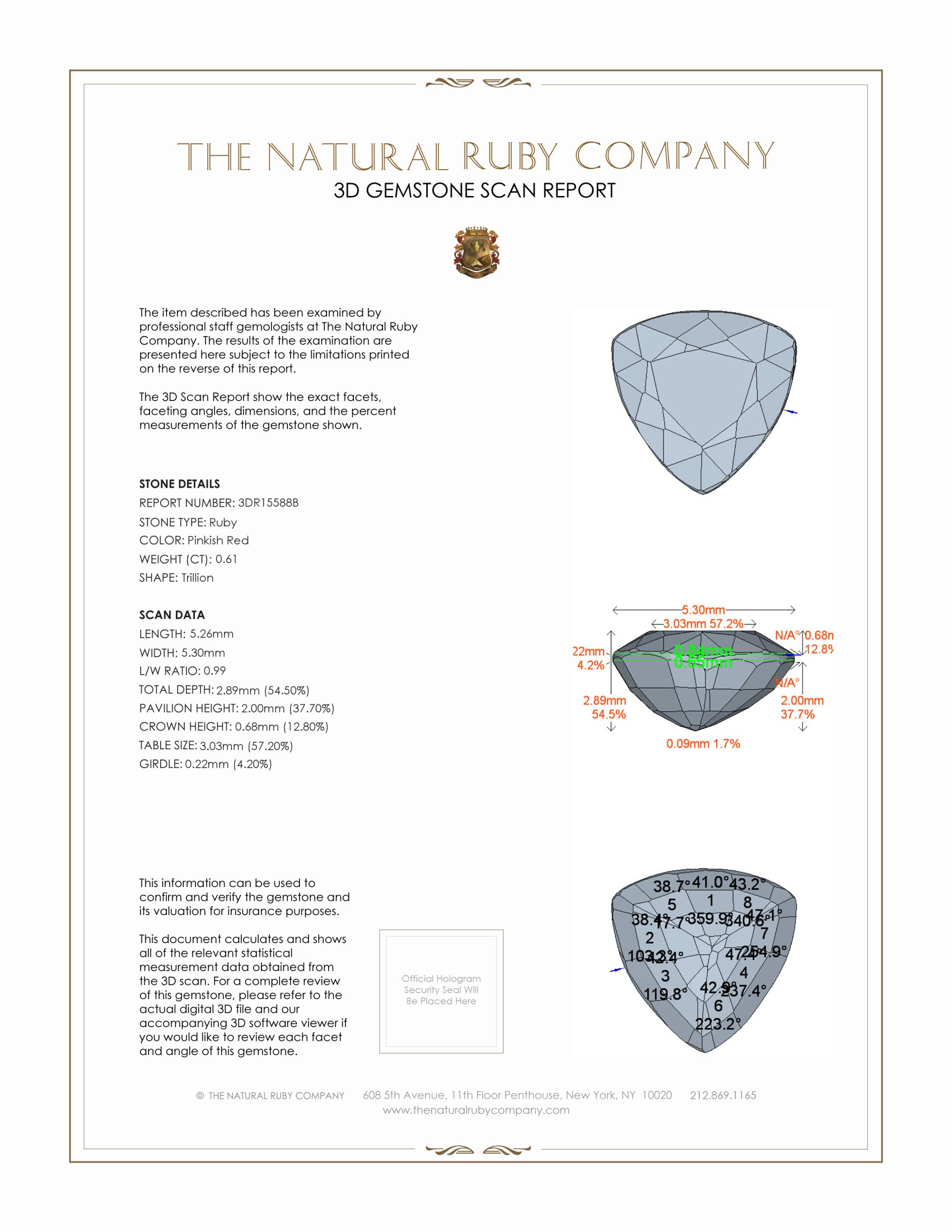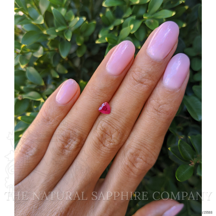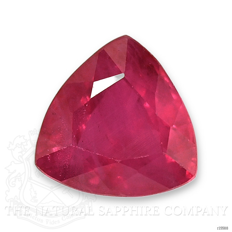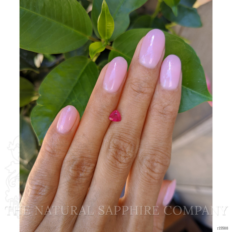 A delicate flame in a triangular embrace, this transparent 0.61 carat trillion shape pinkish red ruby measures 5.26 x 5.30 x 2.89 mm and carries the soul of Madagascar in every facet. The trillion cut sings with a crystalline rhythm, each edge carved to catch light and fold it back into triangular flashes of color and fire. With a clarity graded as very slightly included when viewed at eye level, the stone keeps its purity and honesty, allowing the vivid color intensity to bloom without distraction. The polish is excellent, and the surface mirrors the world with soft, glowing reflections that feel like a private sunrise. Heat treated to enhance its natural voice, this ruby wears its origin and treatment like a whisper, letting its pinkish red heart speak plainly and passionately. At The Natural Ruby Company we have set this gem into words and would be honored to place it into the quiet eloquence of your jewelry, where it can catch a promise and hold it.