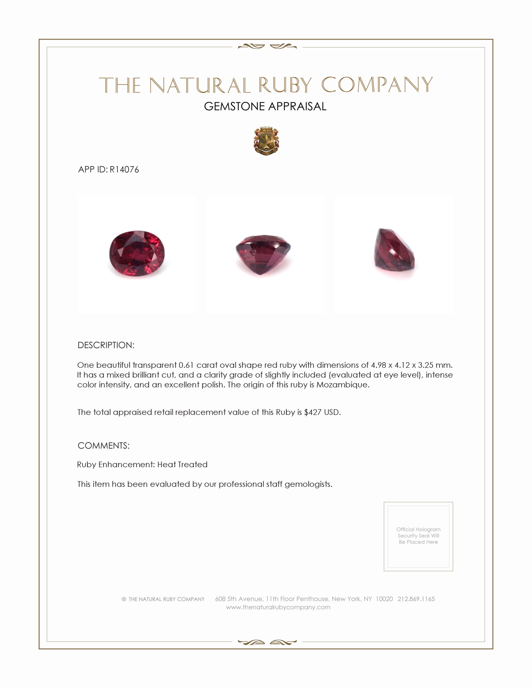 When selecting a gemstone for a custom piece, it is crucial to choose one that will not only stand out on its own but also pair gracefully with other gemstones to create a harmonious and striking design. The Natural Ruby Company's exquisite 0.61 carat oval-shaped red ruby from Mozambique is a gem that promises both beauty and versatility in a custom jewelry piece. This ruby, measuring 4.98 x 4.12 x 3.25 mm, boasts a mixed brilliant cut that captures and reflects light brilliantly, ensuring that it remains the star of any setting. Unlike many other rubies, this gem features an intense color intensity that is sure to draw the eye, while its slightly included clarity grade inspected at eye level adds character without compromising its visual allure.