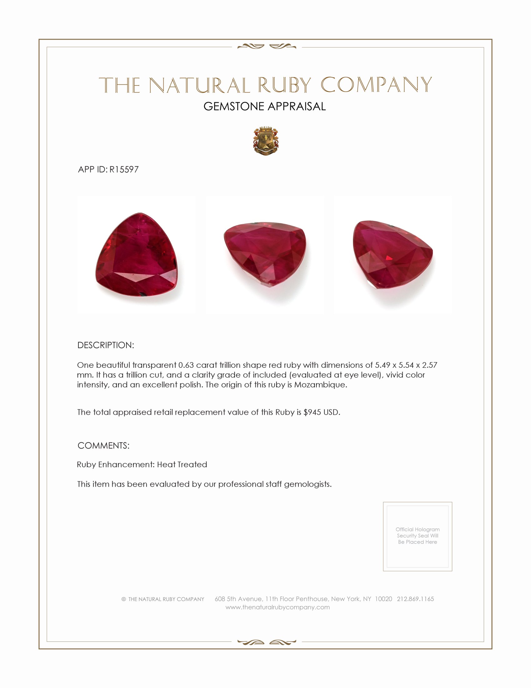 This example from our collection at The Natural Ruby Company is a beautiful transparent 0.63 carat ruby, precisely cut in a trillion shape to maximize brilliance and visual depth. It measures 5.49 by 5.54 by 2.57 millimeters, a size that offers presence on the hand or at the throat while remaining versatile enough for bespoke settings. The stone displays vivid color intensity, a hue that reads rich and saturated under varied lighting, and it receives a clarity grade of included when evaluated at eye level, a common and honest grading that speaks to the natural character of fine rubies. The polish is excellent, allowing the facets to lift color and scintillation with each movement, and the skilled cutting ensures that the triangular form has balanced proportions and crisp facet junctions. The surface finish and internal character together create a gem that is both visually arresting and eminently wearable, a piece that will translate beautifully into a solitaire ring, a refined pendant, or a custom pair of earrings.