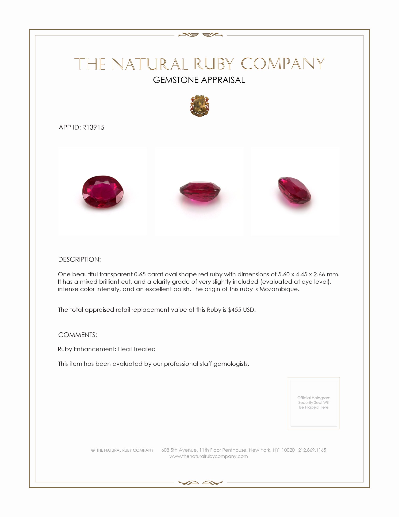In a world where gemstones are increasingly crafted in laboratories, the allure of naturally formed stones remains unrivaled, untouched by human hands until they meet the skilled craftsmen who will showcase their inherent beauty. Our exquisite transparent 0.65 carat oval-shaped red ruby is a testament to the splendor of these natural masterpieces. With dimensions of 5.60 x 4.45 x 2.66 mm, this ruby is a perfect balance between elegance and understated opulence.
