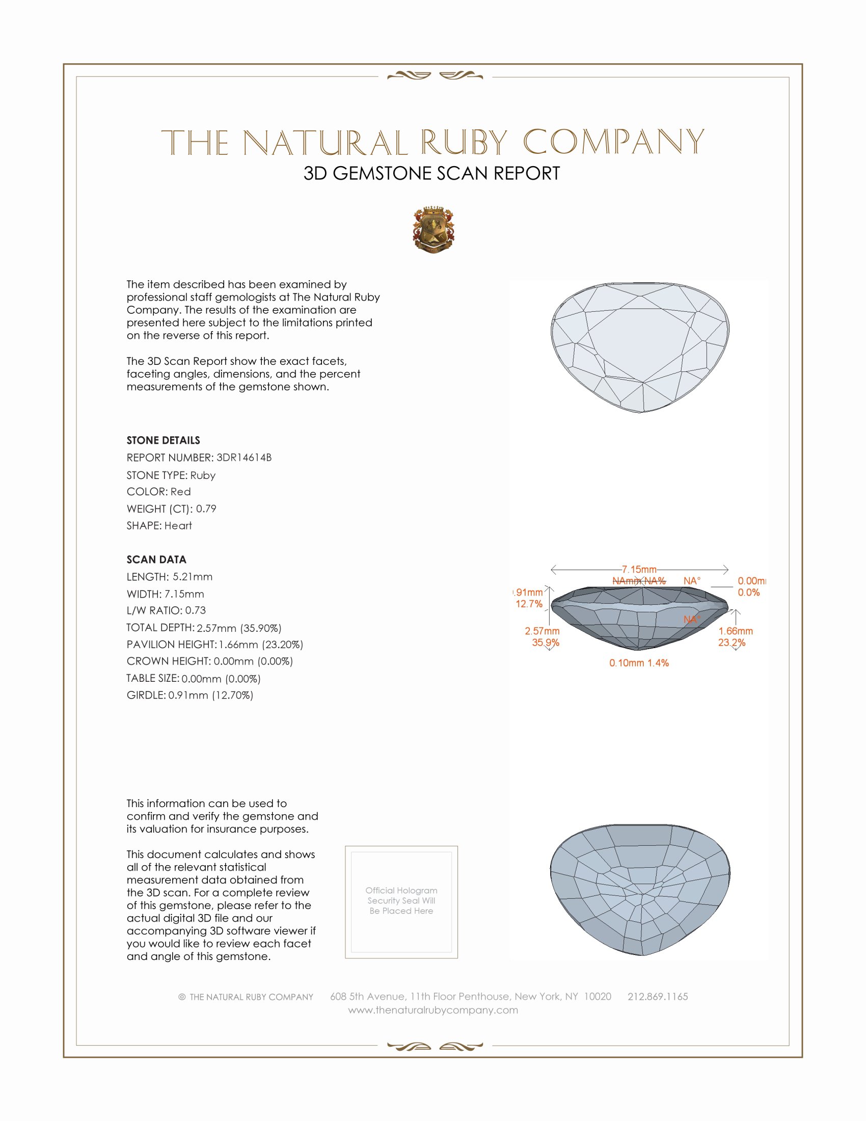 Introducing a rare gem from The Natural Ruby Company, a transparent 0.79 carat heart-shaped ruby from the renowned mines of Mozambique. This exquisite piece measures 5.21 x 7.15 x 2.57 mm and is a masterpiece of nature and artistry, embodying the pinnacle of gemstone refinement. Its mixed brilliant cut highlights the fiery depths of its intense red hue—a hallmark of true rarity and value. Carefully fashioned to reveal a stunning spectrum of light, this ruby invites you into an exclusive world of luxury and sophistication.