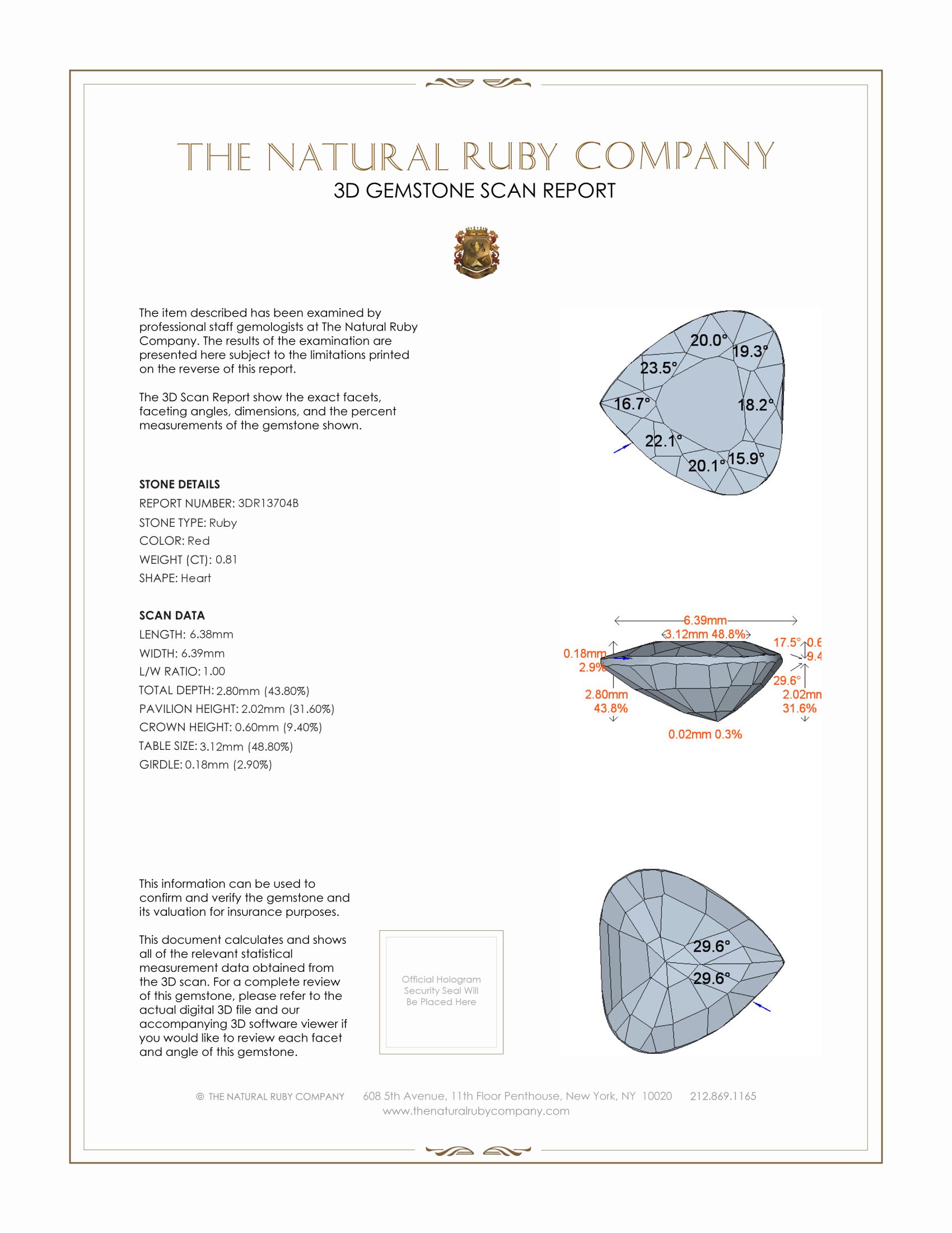 Whether you are in pursuit of the perfect engagement ring, a special anniversary gift, or a unique addition to a fine jewelry collection, this ruby promises to answer your heartfelt desires. The rich red color is not merely an aesthetic attribute but also a testament to one's inner strength and distinction. By choosing this exquisite heart-shaped ruby from The Natural Ruby Company, you invest not just in luxury, but in a heritage of timeless beauty designed to match your individual style. Indeed, your quest for the perfect gem ends here. Let our ruby be a continued source of inspiration and elegance, encapsulating the extraordinary allure you have long sought.