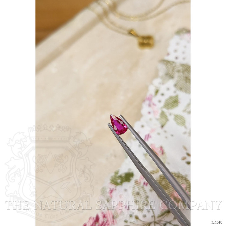 Imagine holding in your hand a rare treasure from the heart of Mozambique. This exquisite 0.81 carat pear-shaped ruby, with its radiant pinkish-red hue, captivates the eye and soul alike. At The Natural Ruby Company, we believe in the power of authentic gemstones to transform mere moments into cherished memories. This ruby’s vibrant, intense color shines brilliantly, symbolizing passion and vitality. Unlike others, this gemstone comes with no enhancement, displaying natural beauty in its purest form. Its unique clarity, evaluated at eye level, showcases characteristics that tell a story—a tale of Earth's incredible artistry woven into every fiber of this precious gem.