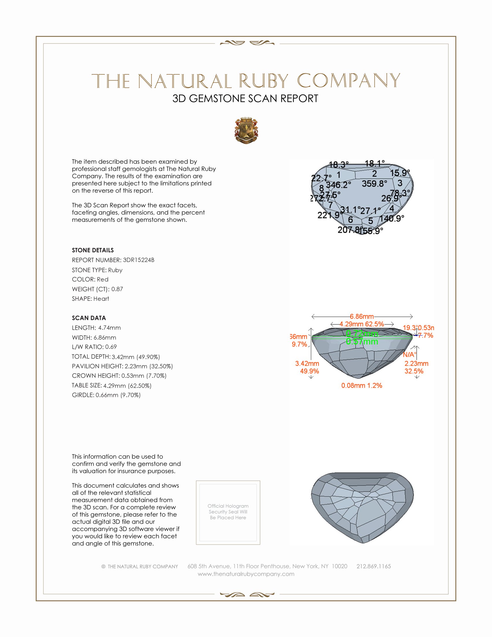 At The Natural Ruby Company, we are proud to present a gemstone that embodies the pinnacle of rarity and elegance. This exquisite 0.87 carat heart-shaped red ruby, sourced from the prestigious mines of Mozambique, is a testament to nature's artistic prowess and the meticulous craftsmanship of our expert gem cutters. Its brilliant crystallinity, alongside a symphony of vivid red hues and a mixed brilliant cut, captures and refracts light in an enchanting display. Beyond its shimmering exterior, this ruby is a piece of a select collection that epitomizes exclusivity, reserved only for those who appreciate true magnificence in its purest form.