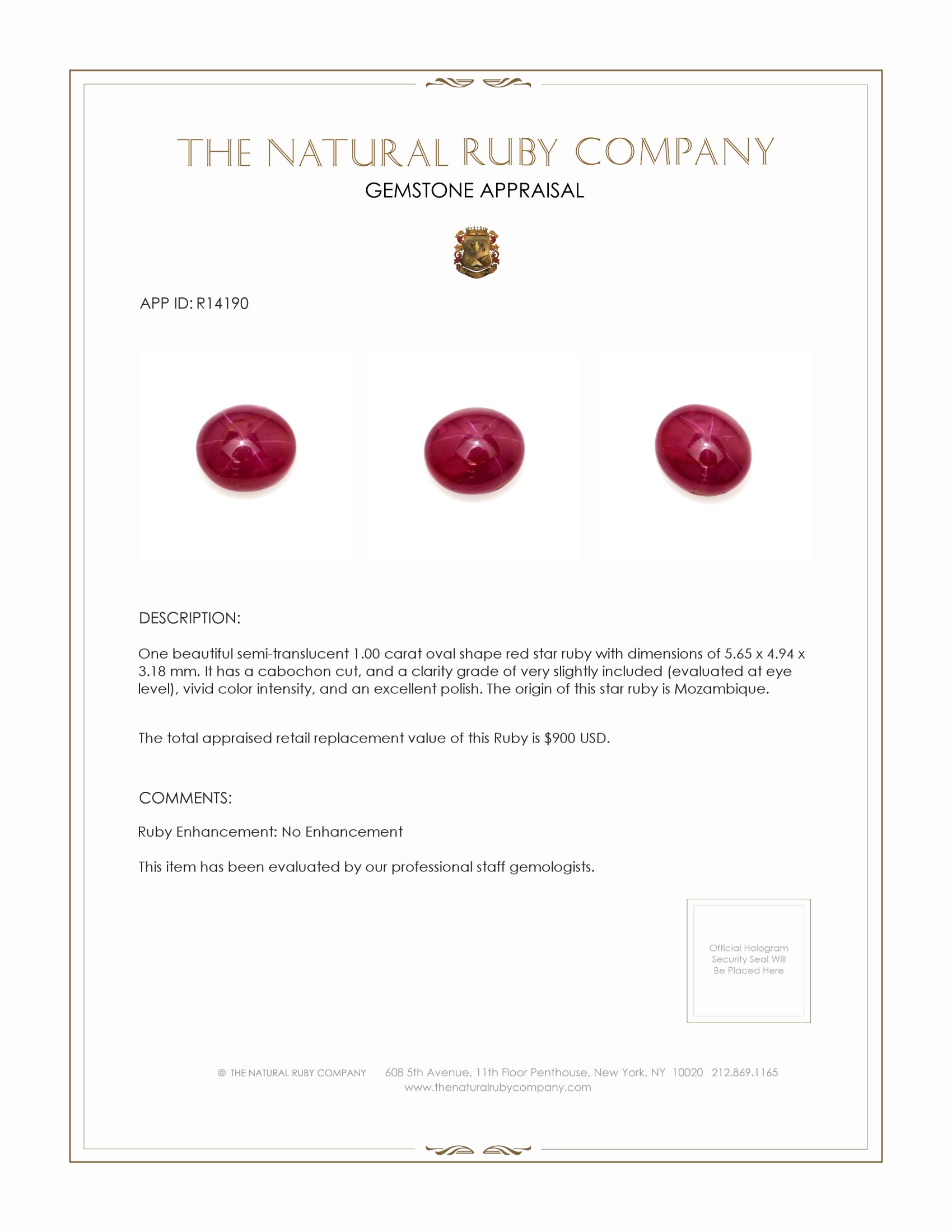 Discover the mesmerizing beauty of our exquisite red star ruby, a gem that holds the promise of bringing your search for the perfect stone to a delightful conclusion. With its breathtaking semi-translucent quality, this 1.00 carat oval-shaped marvel is more than just a gemstone; it is an extraordinary piece from the heart of Mozambique. Designed to captivate, this gem is expertly crafted with a cabochon cut, which helps to showcase its unique characteristics. It's an opportunity to own something truly remarkable, sourced for its excellence in quality and splendor. The Natural Ruby Company is proud to offer this masterpiece to those who seek brilliance matched with authenticity.