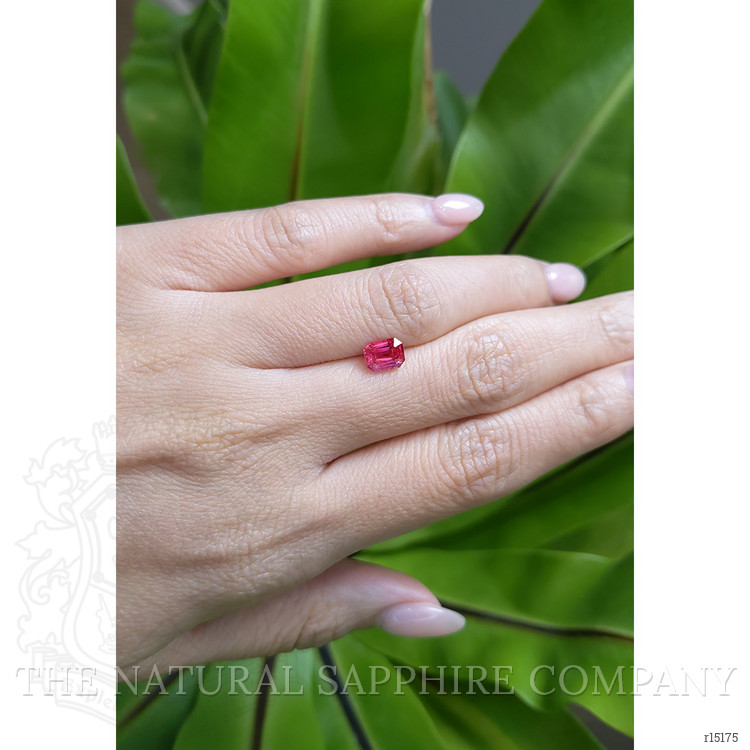 Discover the exquisite beauty of our rare 1.25 carat emerald cut pinkish-red ruby from The Natural Ruby Company. This stunning gemstone, sourced from the exotic landscapes of Thailand, captures the essence of sophistication and elegance. Its transparent quality, enhanced with a medium intense color intensity and an excellent polish, makes it an ideal choice for those seeking a unique centerpiece for an engagement ring or a rare addition to a collector's suite. With dimensions of 6.76 x 5.23 x 3.59 mm, the ruby’s slightly included clarity grade, evaluated at eye level, adds a natural allure that appeals to both seasoned gem enthusiasts and first-time buyers.
