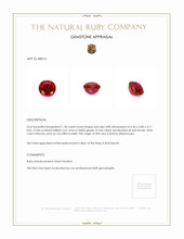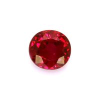 One beautiful transparent 1.36 carat round shape red ruby with dimensions of 6.20 x 5.80 x 4.11 mm. It has a mixed brilliant cut, and a clarity grade of eye clean (evaluated at eye level), vivid color intensity, and an excellent polish. The origin of this ruby is Burma (Myanmar).