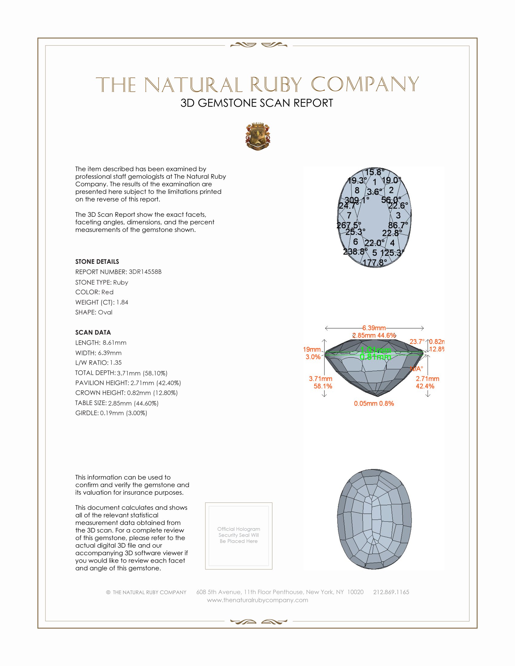 The Natural Ruby Company offers more than a stone. We offer a masterpiece akin to that of long-celebrated gemstones in history. With dimensions of 8.61 x 6.39 x 3.71 mm, this ruby's presence is as commanding as its illustrious predecessors. As you hold this exquisite gem, imagine gifting it, with the promise of timeless beauty that echoes emotions and creates cherished memories. The vivid color intensity is not just seen but felt. It's an emotion in itself. The exceptional polish adds to its allure, ensuring that as light hits the gem, an intimate dance unfolds, mesmerizing a beholder's eyes and heart alike. Witnessing its radiance is akin to encountering the glories of ancient jewels, wrapped in love and captured within its depths.