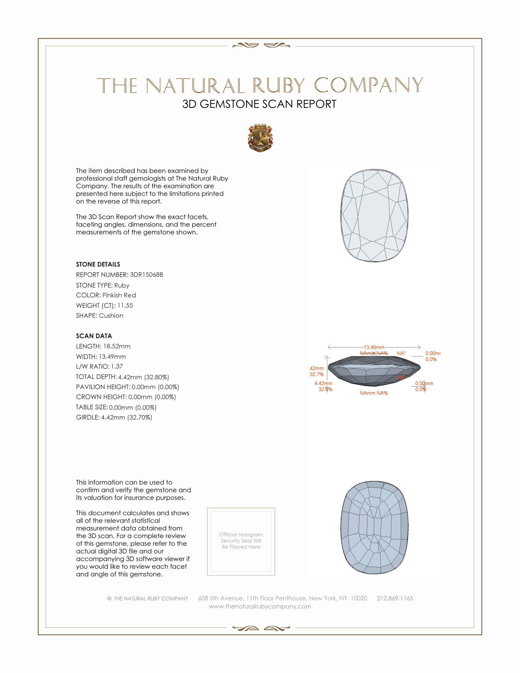 Throughout history, rubies have captivated the imagination and desires of countless generations. Synonymous with passion and power, these gemstones have adorned the crowns of kings and the jewelry of the elites. From their historical significance to their vibrant allure, rubies remain a timeless testament to nature's magnificence. At The Natural Ruby Company, we are proud to present an exquisite 11.55 carat cushion shaped pinkish red ruby, a gemstone that epitomizes the rich legacy and timeless beauty that rubies represent.