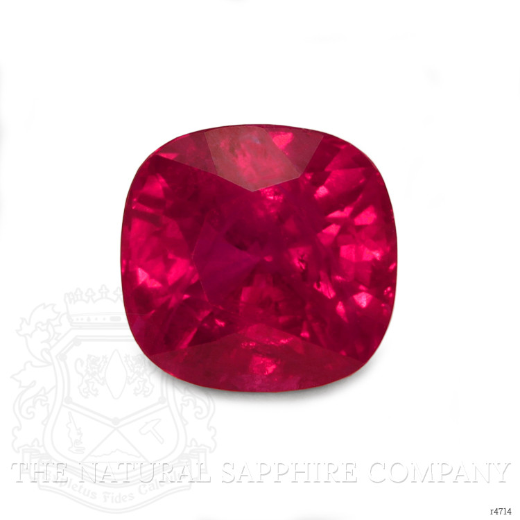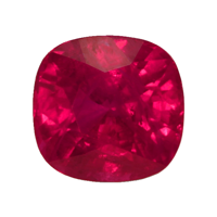 Rubies such as this from Myanmar (formerly Burma), which form in marble, tend to have fluorescence. Fluorescence refers to an object’s ability to emit visible light when exposed to radiant energy. As such, this ruby has the unique characteristic of fluorescing red in daylight. This ruby shows very slight inclusions, which is also desirable, and the overall clarity is excellent. Its color, which has been heated for enhancement as certified by the GemResearch Swisslab in Lucerne, Switzerland, permeates impeccably throughout the ruby. We rate this saturation at a “vivid” color-intensity rating. At 2.02 carats, it’s a sizeable natural ruby, and its cushion shape exhibits an excellent depth percentage, giving it a nice size when viewed from above.