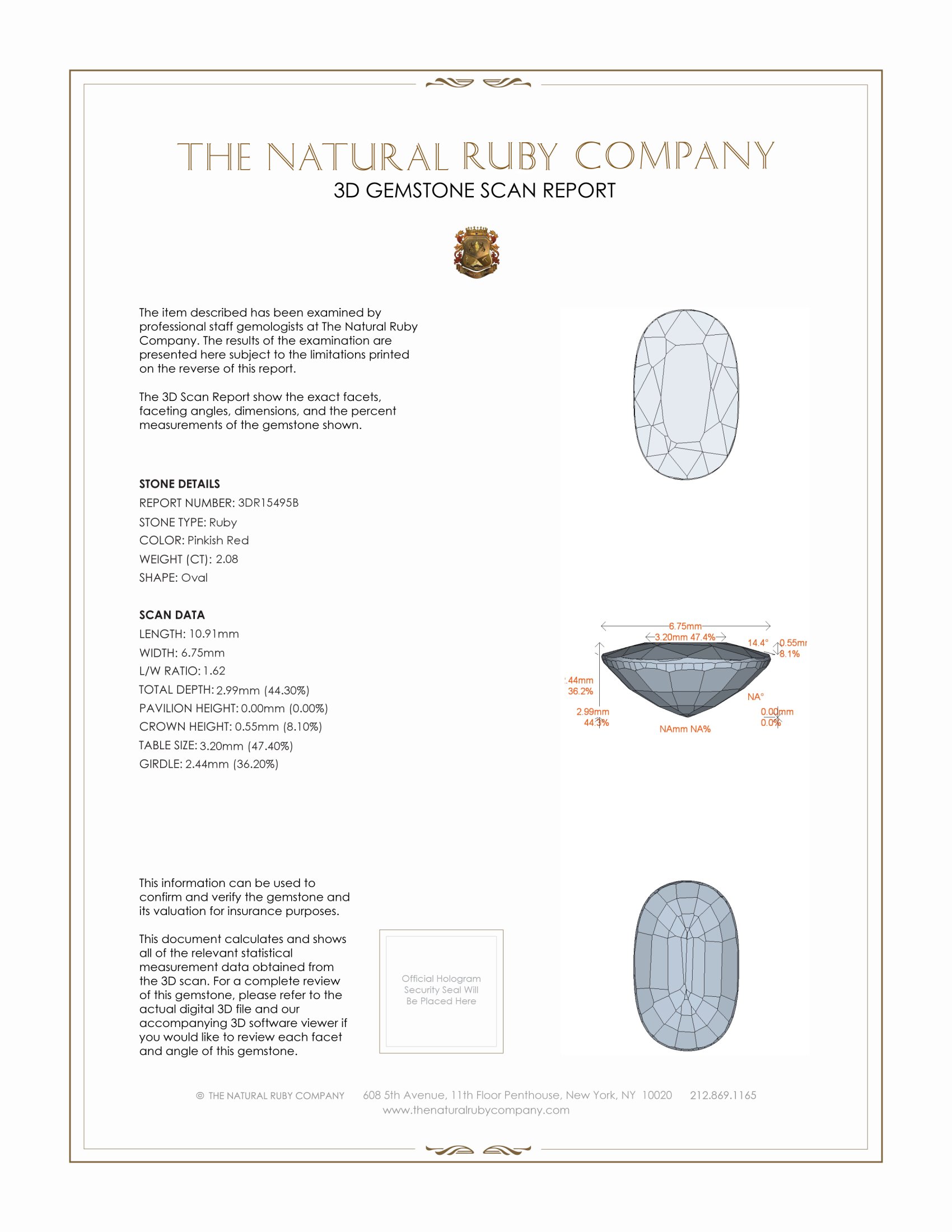 There are gemstones that speak in whispers of antiquity, and then there is this extraordinary Mozambique ruby that announces itself with the confident voice of centuries of reverence. We present a transparent 2.08 carat oval shape ruby, measuring 10.91 by 6.75 by 2.99 mm, cut in a mixed brilliant style that balances fire and color with a refined, classical silhouette. Its pinkish red hue glows with vivid color intensity, and an excellent polish allows light to travel across the facets with assured elegance. Evaluated at eye level the clarity grade is included, which in no way diminishes its inherent charm, rather it testifies to its natural origin and the journey this stone has made from the earth to the jeweler. Heat treated to enhance its visual purity and color strength, this gem carries the hallmark of centuries of gemstone trade practices that have honed raw beauty into wearable art. At The Natural Ruby Company we recognize that provenance matters, and the Mozambique origin of this ruby connects it to recent deposits that have captivated connoisseurs with rich saturation and brightness that rival historic sources.