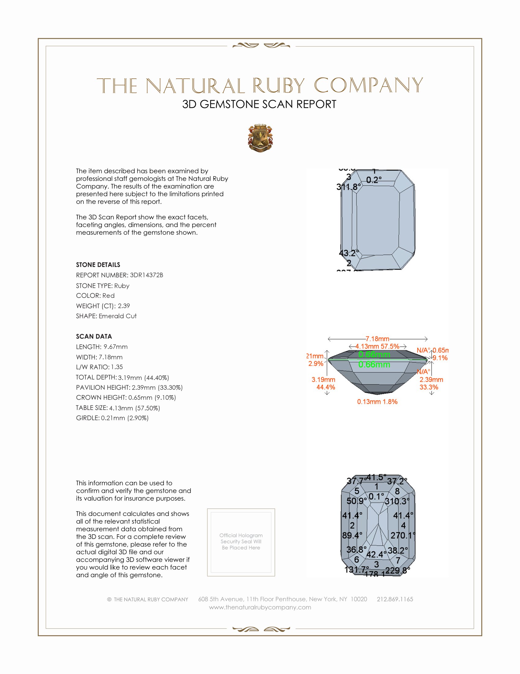 The Natural Ruby Company proudly presents a stunning 2.39 carat ruby that exemplifies both beauty and precision. Expertly crafted in an emerald cut shape, this gemstone measures 9.67 x 7.18 x 3.19 mm. The emerald cut is renowned for its clean lines and sophisticated appeal, highlighting the stone's inherent transparency. This layout emphasizes the vibrant depths and striking quality of the ruby’s vivid red hue. With a clarity grade assessed as eye clean, any inclusions are minuscule, imperceptible to the naked eye, confirming both the rarity and appeal of this exquisite gem. The excellent polish achieved by our skilled craftsmen ensures that this ruby captivates aficionados, reflecting light with pristine clarity and brilliance.