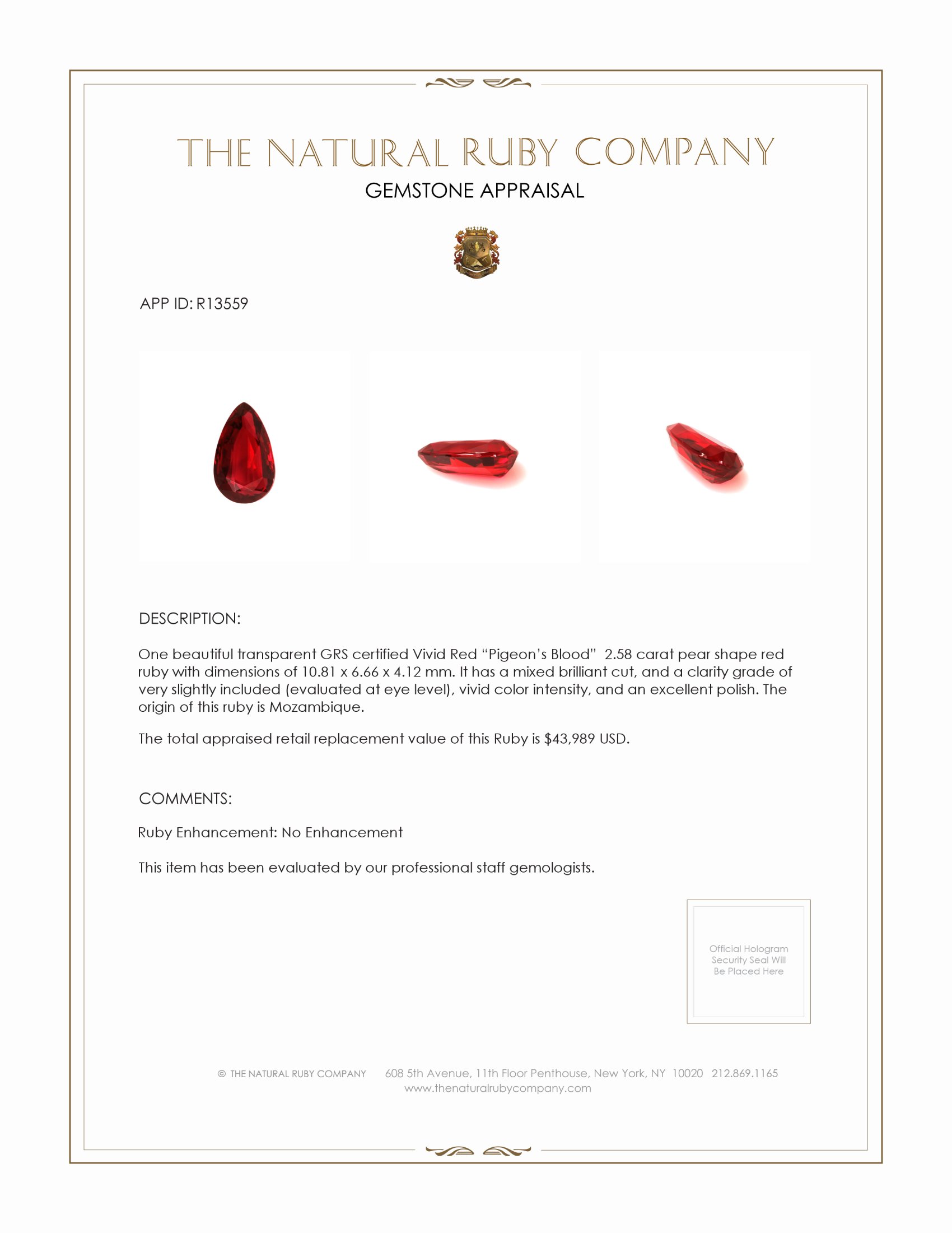 In the heart of every legend lies a gem that transcends mere beauty, embodying the depths of desire and eternity. Our GRS certified Vivid Red "Pigeon's Blood" ruby, a treasure unveiled by the skilled hands of nature in Mozambique, captures this essence with striking allure. As sunlight dances upon its surface, this 2.58 carat masterpiece reveals a tapestry of fiery brilliance. It possesses a luminous soul, whispering tales of passion and dreams in its rich, vivid reds. The pear-shaped elegance measures 10.81 x 6.66 x 4.12 mm, and with its mixed brilliant cut, it promises a reflection that speaks of endless romance. At The Natural Ruby Company, we treasure the artistry that each gemstone holds, ensuring that each piece isn't just a stone, but an emblem of love's profound journey.