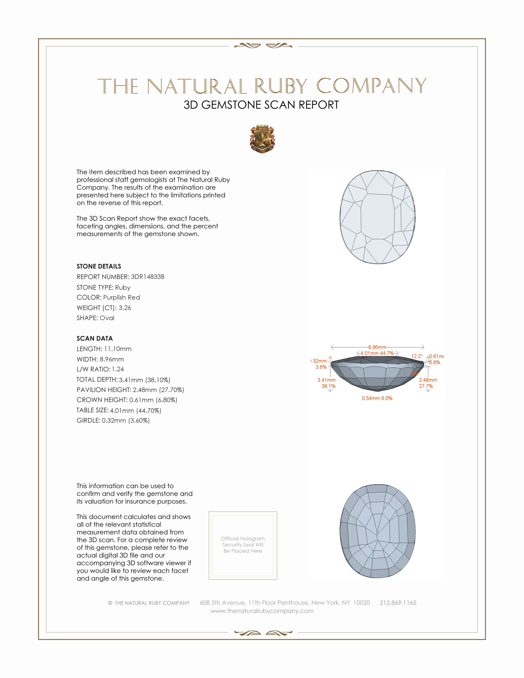 The ruby presented here is an exquisite gemstone that embodies a fine blend of quality and distinctive features. This beautiful transparent 3.26 carat oval purplish-red ruby stands as a testament to the allure unique to gemstones of this caliber. Measuring 11.10 x 8.96 x 3.41 mm, the ruby showcases a mixed brilliant cut, optimized to reveal its visual elegance to the greatest degree. Its intense color intensity is notably captivating, drawing the gaze with its rich purplish-red hue. Despite a clarity grade of included, the ruby maintains its charm, enhanced by an excellent polish that contributes to its outstanding visual appeal.