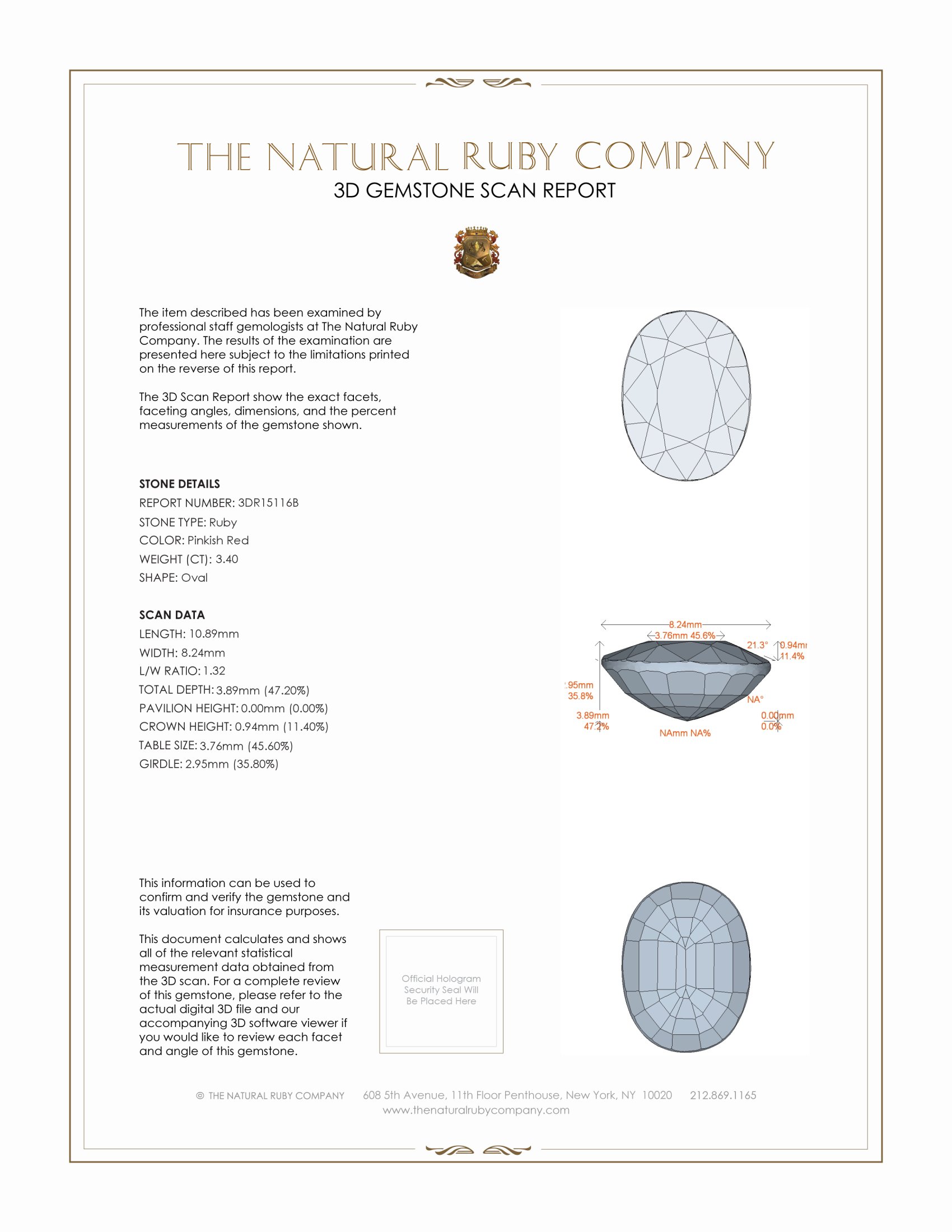 Introducing a remarkable gemstone that embodies elegance and exquisite craftsmanship—a 3.40 carat oval-shaped ruby with origins in the mineral-rich lands of Mozambique. This captivating gem, offered by The Natural Ruby Company, features dimensions of 10.89 x 8.24 x 3.89 mm and showcases a mixed brilliant cut. Its intense pinkish-red hue is enhanced by the expert heat treatment it has undergone. This process not only amplifies its vibrant color intensity but also respects the natural essence of the ruby, ensuring it possesses the optimal visual appeal that a conscious consumer would admire.