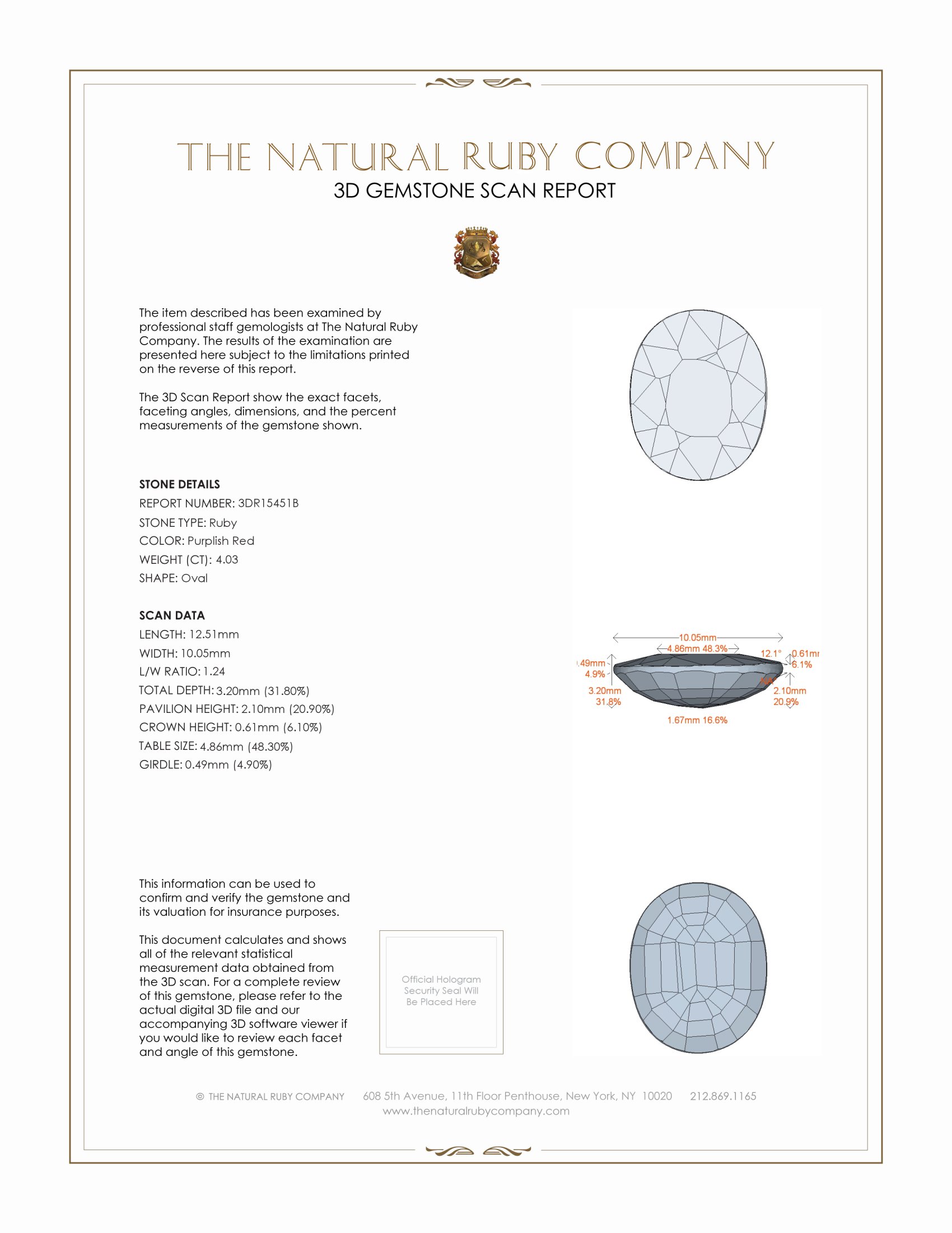 This 4.03 carat oval purplish red ruby from Mozambique presents a clear and consistent description of its material and workmanship. The gem measures 12.51 x 10.05 x 3.20 millimeters and has been cut in a mixed brilliant style to balance internal color saturation with surface brilliance. Clarity is graded as slightly included at eye level, and the stone remains transparent, with vivid color intensity and an excellent polish. The material has been heat treated, a standard enhancement that improves tone and saturation while preserving the stone's natural character. The Natural Ruby Company presents this ruby as a well proportioned example of Mozambique material, combining substantial carat weight with a strong visual presence suitable for a variety of settings.