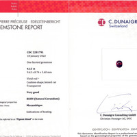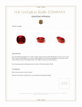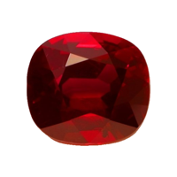 One beautiful transparent 4.13 carat cushion shape red ruby with dimensions of 9.62 x 8.73 x 5.60 mm. It has a mixed brilliant cut, and a clarity grade of eye clean (evaluated at eye level), vivid color intensity, and an excellent polish. The origin of this ruby is Mozambique.