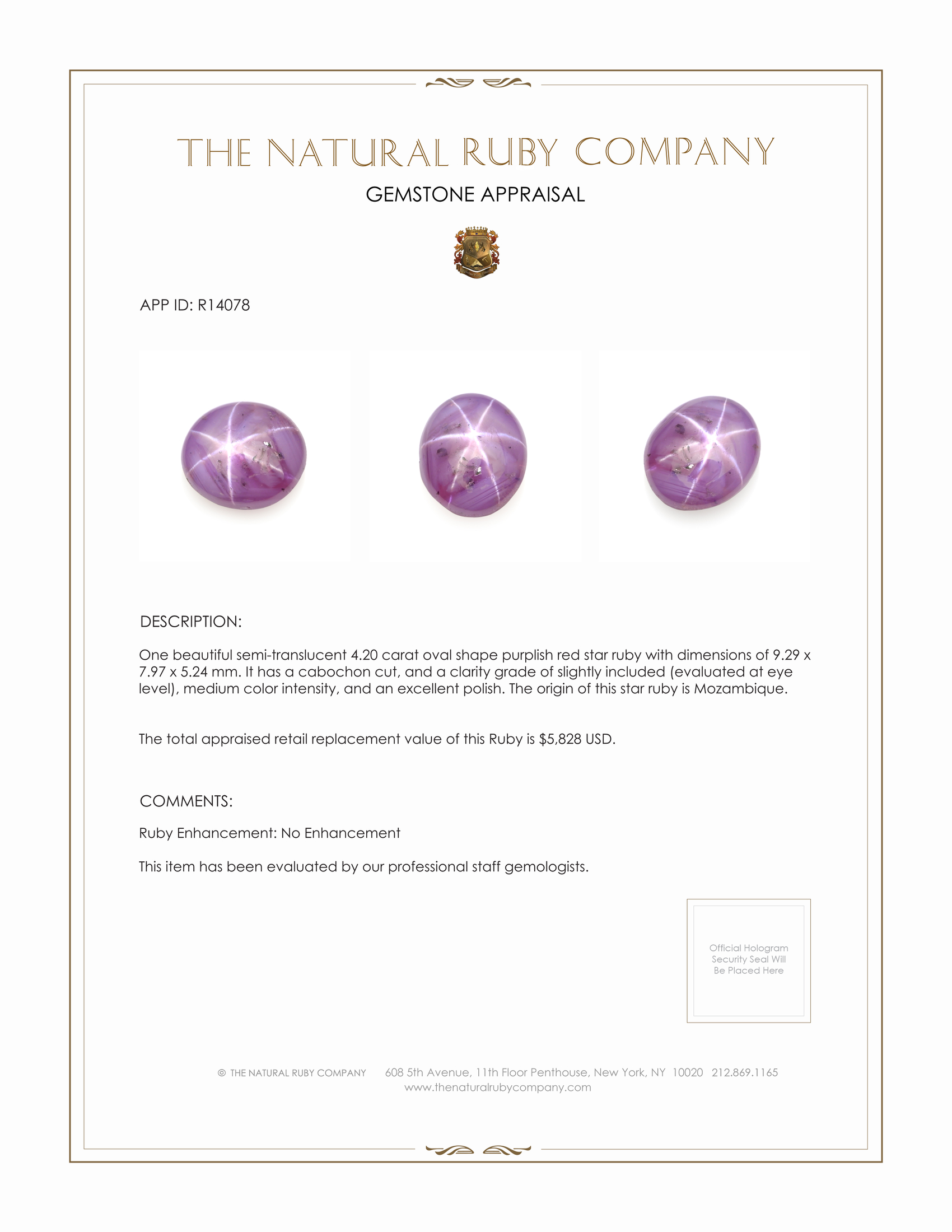 Introducing a captivating 4.20 carat oval-shaped purplish-red star ruby that exemplifies the beauty and rarity associated with nature's most precious gemstones. This exquisite piece, sourced from the renowned gemstone-rich lands of Mozambique, measures 9.29 x 7.97 x 5.24 millimeters, offering a fine balance between size and elegance. Its semi-translucent body reveals a striking cabochon cut, accentuated by the distinct star phenomenon for which such rubies are celebrated. The star ruby's asterism, an optical phenomenon that produces a star-like figure on its surface, is a marvel of the gem's intricate internal structure. This structure diffracts light into a pattern that is as unique as it is beautiful, setting this gemstone apart from others.