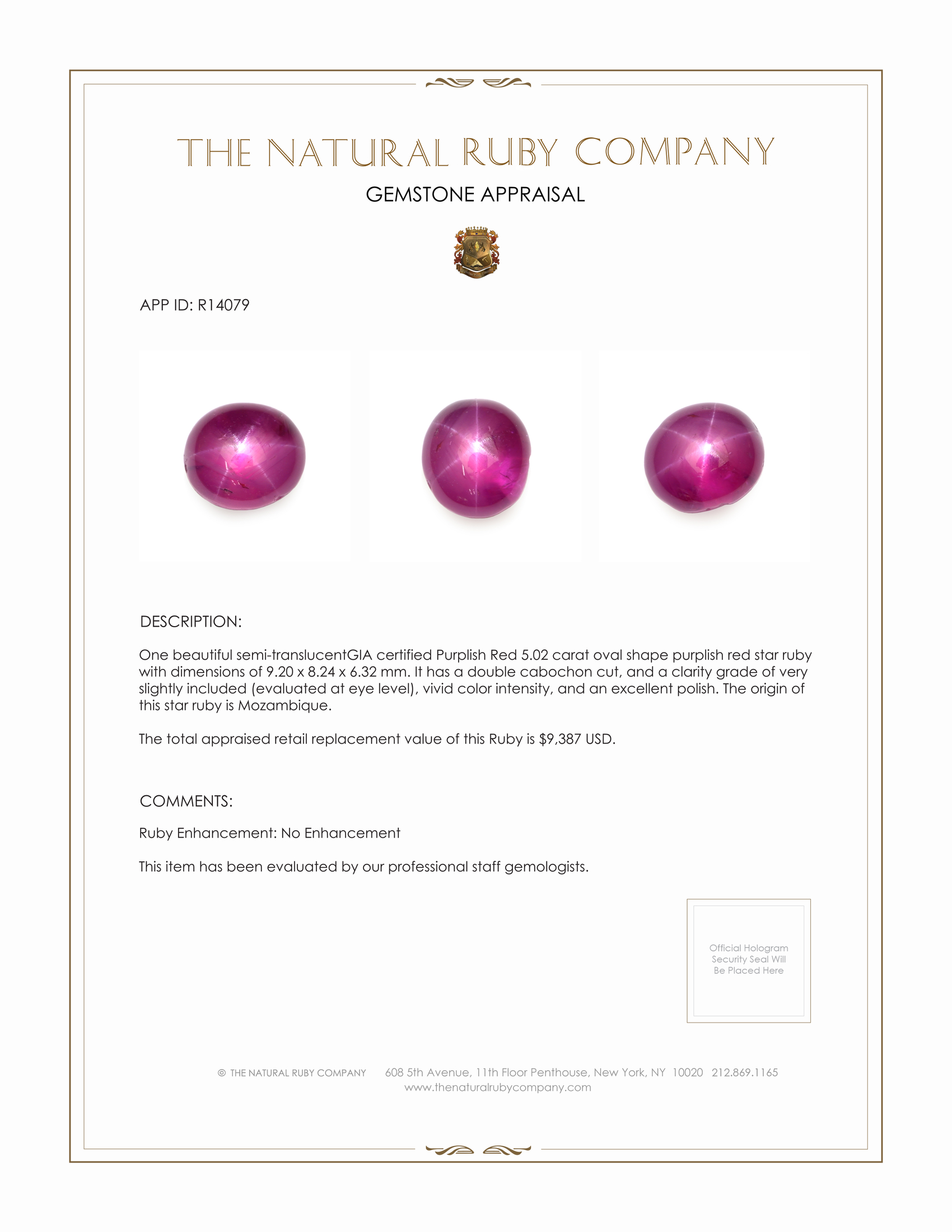 Over the years, this star ruby will not only increase in value but also multiply the memories it shares with you, becoming an integral part of your most cherished moments. Whether gifted as a token of love or passed down as a precious heirloom, its beauty promises to touch the hearts of those who gaze upon it. The enduring elegance of this gemstone makes it as timeless as the emotions it conceives, ensuring that each time its owner looks upon it, they will be reminded of the profound feelings of joy, love, and excitement that it embodies. At The Natural Ruby Company, we believe that every gemstone is an opportunity to connect deeply, to bond with the depths of nature's artistry, to spark eternal joy in our souls. Let this star ruby become the beating heart of your own everlasting legacy.