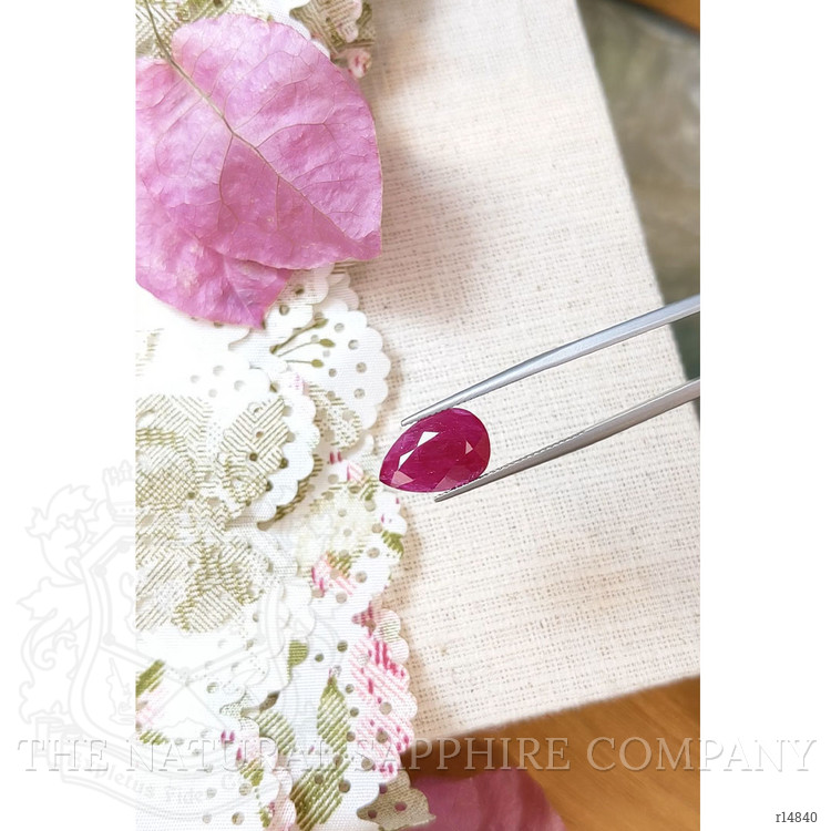 In the heart of a sunlit labyrinth, where dreams weave themselves into tapestries of color, resides an extraordinary gemstone—a 6.51 carat purplish red ruby that shimmers like the whispers of a twilight reverie. Crafted by nature and polished to perfection, this magnificent pear-shaped treasure bears the soul of its birthplace, Mozambique. Its dimensions—14.84 x 9.82 x 5.21 mm—speak of meticulous artistry, like a universe captured within the embrace of a single droplet of passion.