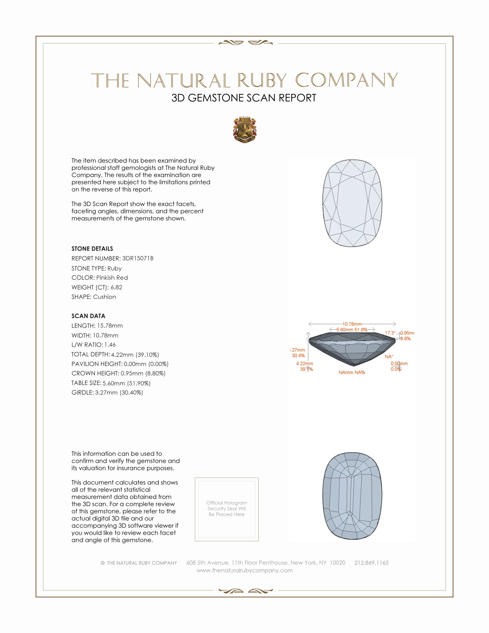 Discover the allure of elegance with this exquisite ruby from The Natural Ruby Company, where luxury finds its truest expression. This stunning gemstone, a beautiful transparent 6.82 carat cushion shape pinkish red ruby, encapsulates the true essence of sophistication. With dimensions of 15.78 x 10.78 x 4.22 mm, this ruby captures light in a dance of reflection and refraction, creating a mesmerizing visual feast. Its mixed brilliant cut enhances the stone's innate brilliance, ensuring that it sparkles with every movement.